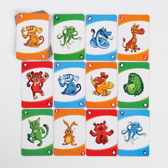 Перед началом игры каждый участник получает по 7 карт. Остальные выкладываются в стопку рубашкой вверх, а верхняя переворачивается и кладётся отдельно. Игрокам нужно внимательно следить за картами и по очереди выкладывать из своей колоды те, которые совпадают с ними цветом или картинкой. Увидели зайчика на зелёном фоне? Скорее выкладывайте на него карточку с таким же изображением. А если её нет, подойдёт любой персонаж на зелёном фоне.