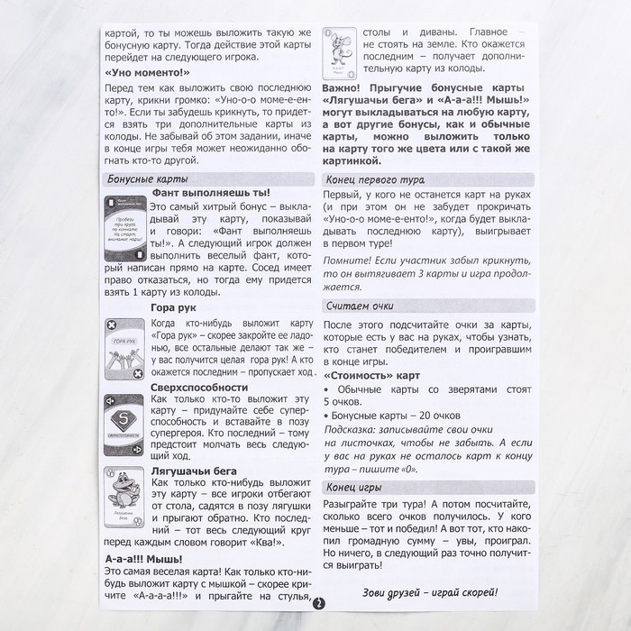 В этой игре есть множество бонусных карт. Вставайте в позу супергероя, устраивайте лягушачьи бега или выполняйте весёлые фанты. А если вы увидите картинку с мышью, скорее забирайтесь на стул, ведь тот, кто сделает это последним, возьмёт из колоды дополнительную карточку.