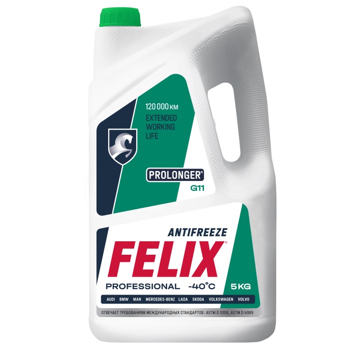 Антифриз Felix Prolonger G11 представляет собой жидкость охлаждающую низкозамерзающую на основе этиленгликоля и специально очищенной воды, не содержащую аминов, фосфатов и боратов. Разработан по гибридной технологии, содержит в себе набор силикатных присадок. Обеспечивает быстрый прогрев двигателя при отрицательных температурах окружающего воздуха до -40 °С. Обладает повышенной термостабильностью и теплопроводностью. Исключает возможность образования накипи и отложений. Имеет оптимальные смазывающие свойства. Готов к применению. Срок службы антифриза — 120 000 км или 3 года.