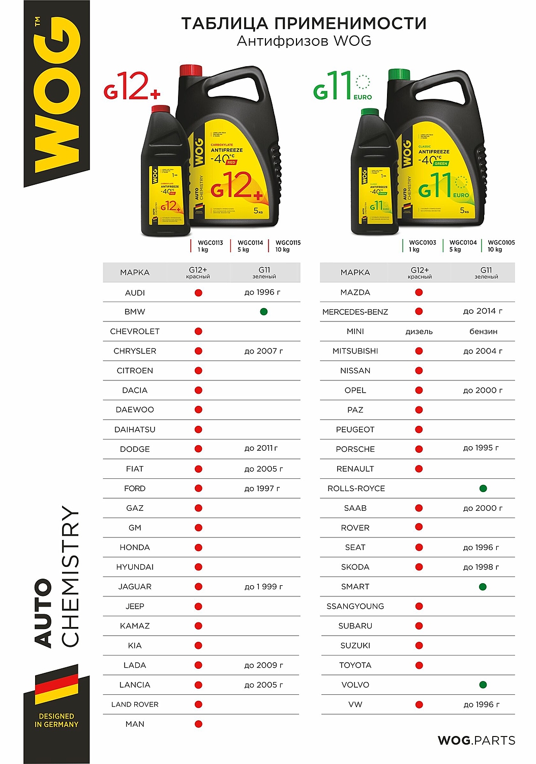 Классический антифриз WOG G11 -40 рекомендован для применения в системах охлаждения двигателей легковых и грузовых автомобилей, спецтехники. Гарантирует усиленную защиту от коррозии и обладает высокими смазывающими свойствами. Новейшая технология Long Life Tech гарантирует эффективное охлаждение и долговременную защиту двигателя от перегрева в течение 3 лет. Безопасен для систем охлаждения, содержащих алюминиевые элементы.