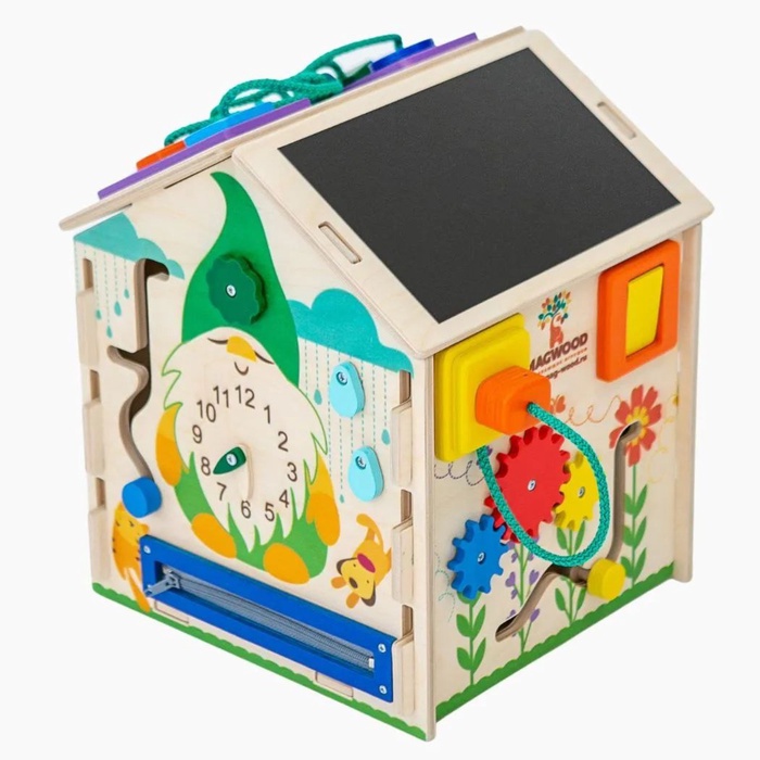 На сторонах домика размещены различные игровые элементы: замочки, вращающиеся детали, шестерёнки, лабиринты и другие механизмы. Во время игры ребёнок тренирует мелкую моторику, учится понимать причинно-следственные связи и развивает воображение. Такой развивающий домик подходит для детей от 3 лет и станет интересным занятием дома.