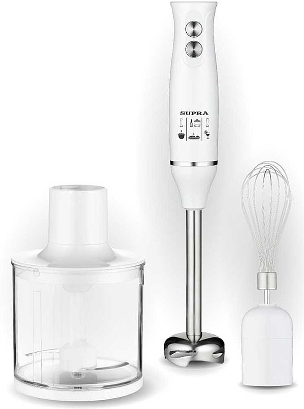 Блендер SUPRA HBS-1034SS – мощная модель, способная работать со скоростью 21000 оборотов в минуту. Это позволяет ему очень быстро пюрировать супы и соусы, превращать в фарш мясо и взбивать белки, сливки или яйца для бисквита. В чаше измельчителя можно сделать салат или смолоть кофе или перец. Погружной блендер хорош для работы как с большими, так и с малыми объемами продуктов, например, с мясным пюре для прикорма младенца. А суп с ним можно превращать в пюре прямо в кастрюле: конструкция рабочей головки не позволит ножу повредить внутреннее покрытие кастрюли.