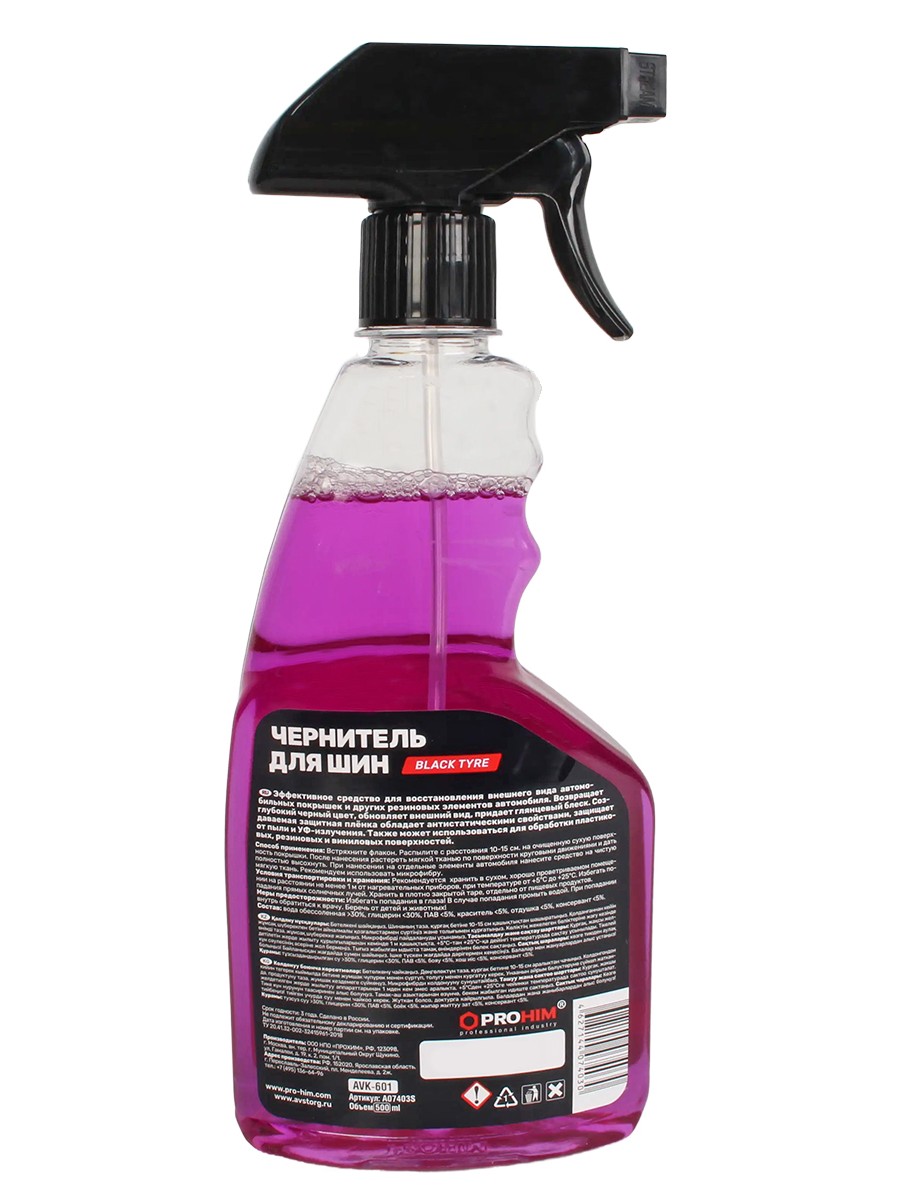 Эффективное средство для восстановления внешнего вида автомобильных покрышек и других резиновых элементов автомобиля. Возвращает глубокий черный цвет, обновляет внешний вид, придает глянцевый блеск. Создаваемая защитная плёнка обладает антистатическими свойствами, защищает от пыли и УФ-излучения. Также может использоваться для обработки пластиковых, резиновых и виниловых поверхностей.