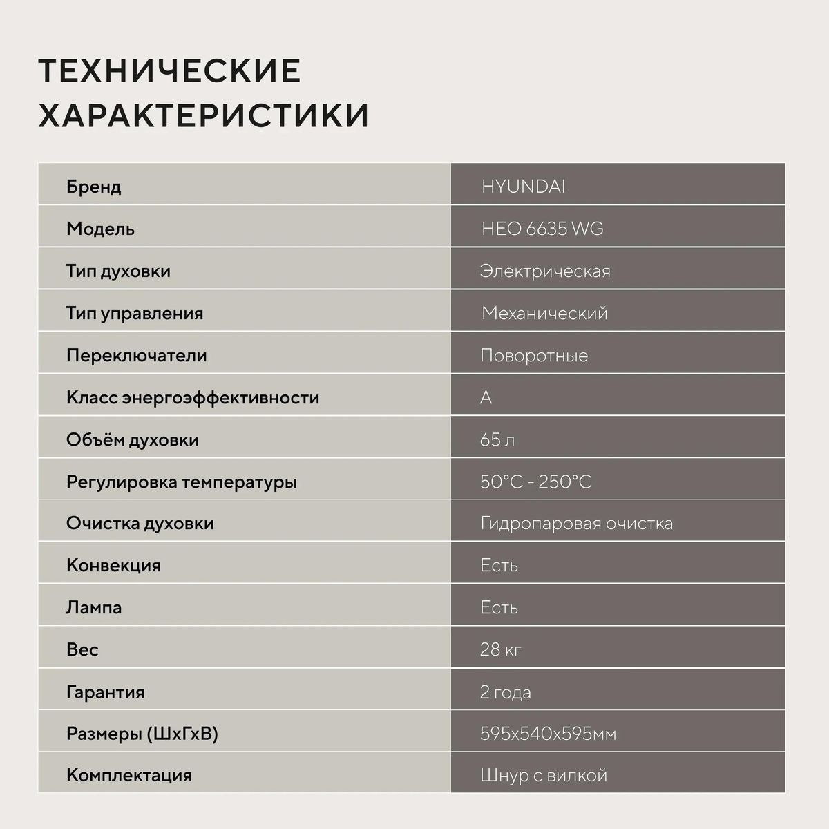 Духовой шкаф Hyundai HEO 6635 WG — это независимый электрический встраиваемый шкаф белого цвета с поворотными переключателями, объемом 60 л, максимальной температурой 250°C, классом энергоэффективности A, оснащенный грилем, конвекцией, таймером (оповещение) и внутренним покрытием из эмали легкой очистки. Он имеет галогенную подсветку, вентилятор охлаждения и полностью стеклянную внутреннюю поверхность дверцы, а открывание дверцы происходит вниз.