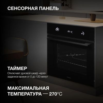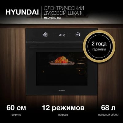 Встраиваемый духовой шкаф Hyundai HEO 6752 BG объемом 68 л с электронным управлением позволит получать удовольствие от готовки. Богатый выбор режимов и точность настроек помогут приготовить ваши любимые блюда с минимальными усилиями. Информативное сенсорное управление. Для выбора режима и регулировки степени нагрева с точностью до градуса достаточно легкого касания. В панели предусмотрена индикация состояния с подсветкой. Максимальная температура 270 ℃. Точная регулировка температуры в широком диапазоне обеспечит оптимальные условия для приготовления в соответствии с рецептом. Электронный таймер. Своевременно напомнит о необходимости изменения режима или добавления ингредиентов и отключит нагрев. В режиме ожидания служит в качестве часов. Конвекция. Создаваемый встроенным вентилятором поток горячего воздуха способствует быстрому и равномерному прогреву. Гриль. Поможет получить румяную корочку на поверхности мяса, птицы или выпечки. Вертел со съемной ручкой. Позволит приготовить курицу-гриль, шашлык или кебаб. Телескопические направляющие. Упрощают загрузку и извлечение форм для запекания или продуктов, а также добавление компонентов в процессе готовки. 12 режимов работы. Использование множества режимов нагрева, вентилятора и механизма вращения вертела в разных комбинациях расширяют список доступных блюд. Дверца с тройным стеклом. Гарантирует качественную теплоизоляцию и исключает вероятность ожога. Внутренняя поверхность без лишних деталей. Упрощает процесс очистки от загрязнений, образующихся при готовке. Благодаря минималистичному дизайну в черном цвете встраиваемый духовой шкаф Hyundai HEO 6752 BG будет прекрасно смотреться на любой современной кухне.