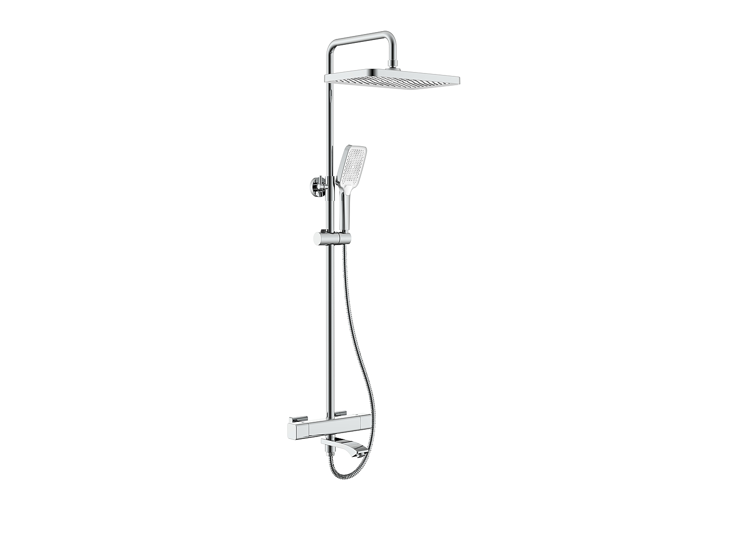 В комплект входит поворотный излив с функцией переключения — он удобен для наполнения ванны. Верхний душ прямоугольной формы (340 × 220 мм) создаёт равномерный поток воды, имитирующий тропический дождь. Ручной душ также прямоугольной формы оснащён тремя режимами струи — переключение осуществляется с помощью кнопки. Душевой шланг длиной 1500 мм выполнен из металла и защищён от перекручивания.