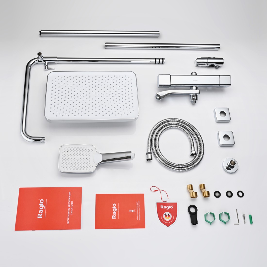 Комплектация включает: термостатический картридж, аэратор, переключатель с керамическими пластинами, переключатель в изливе, душевой шланг, душевую штангу с крепежом, ручную лейку с держателем, верхнюю лейку, присоединительную группу для настенного крепления с отражателями, ключ для аэратора, а также паспорт изделия, инструкцию по монтажу и гарантийный талон.