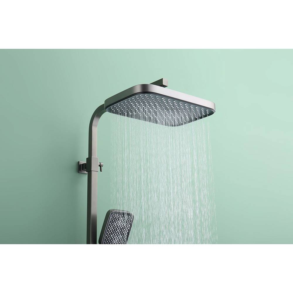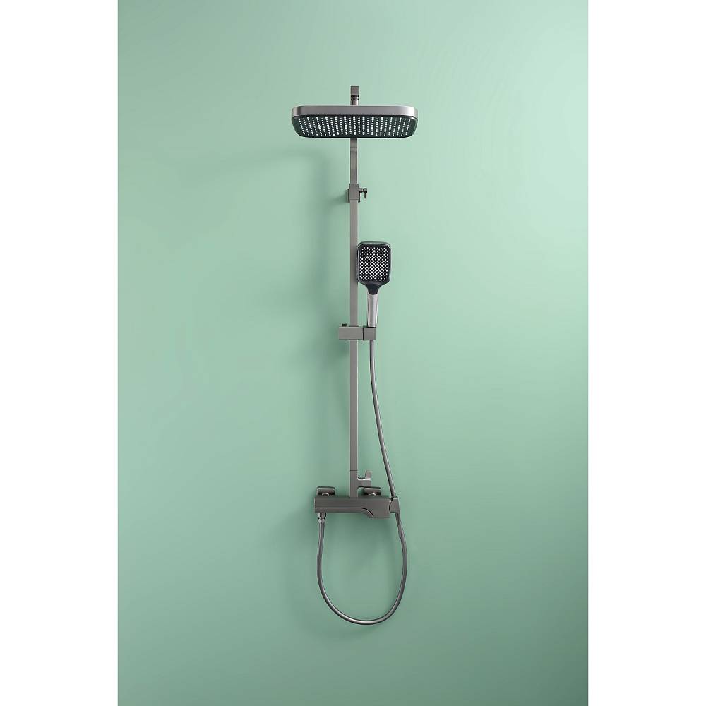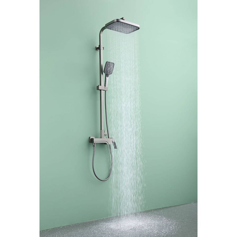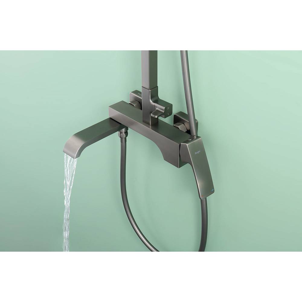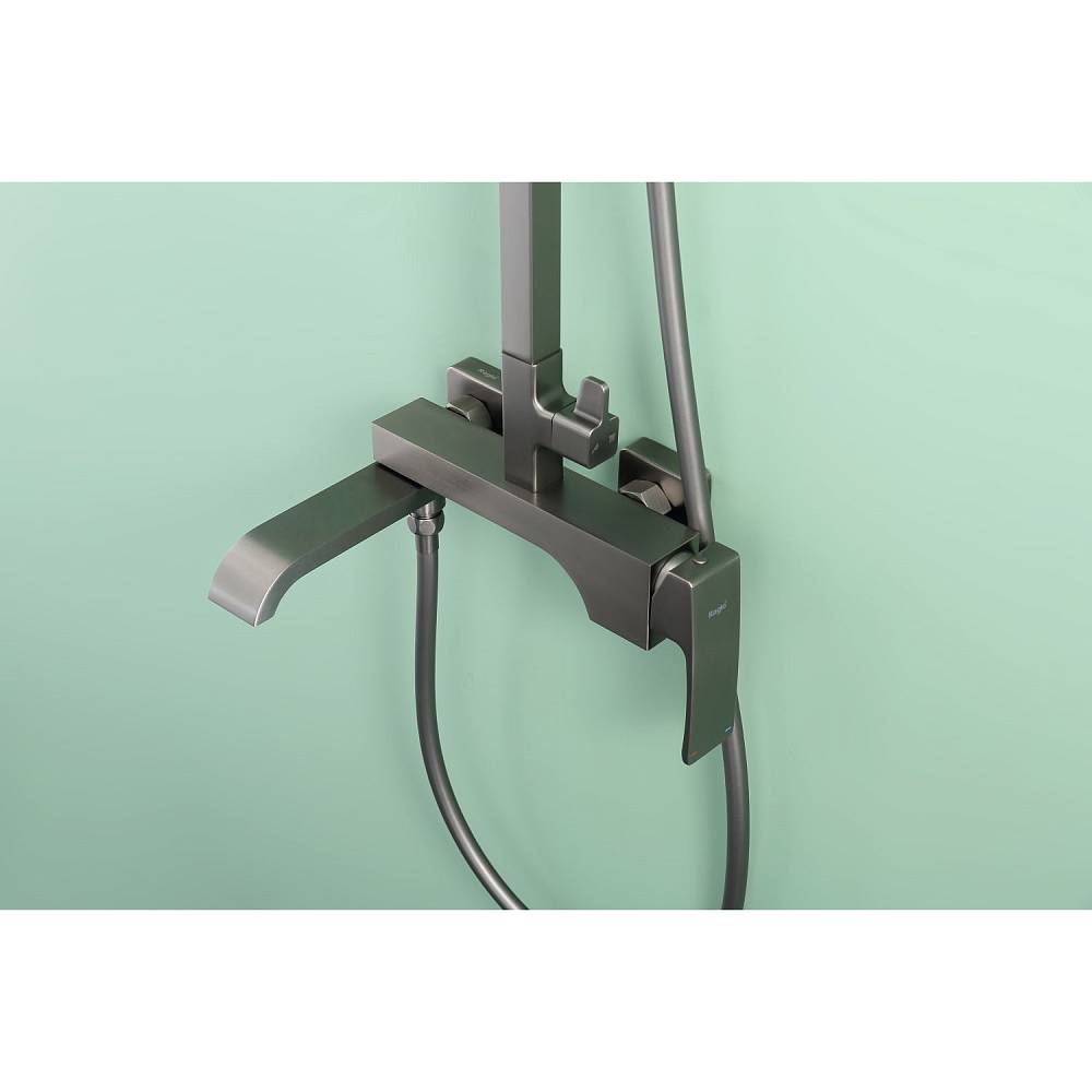 Душевая система Raglo R02.24.09 в цвете «графит» — это настенная модель с однорычажным смесителем, отличающаяся минималистичным дизайном и функциональностью. Основа из латуни гарантирует прочность и устойчивость к коррозии. Керамический картридж обеспечивает точное и плавное регулирование температуры и напора воды. В комплект включены: прямоугольный верхний душ (280 × 190 мм), ручной душ с тремя режимами струи (переключение кнопкой), металлический шланг длиной 1,5 м, регулируемая штанга, держатель для ручного душа и монтажные элементы (эксцентрики с отражателями). Излив каскадного типа имеет поворотную конструкцию (17 см), удобную для наполнения ванны. Система оснащена аэратором для равномерной подачи воды и антиизвестковым покрытием, упрощающим уход. Высота конструкции — 142 см, вылет верхнего душа — 37 см. Стандарт подводки — G 1/2, пропускная способность — до 44 л/мин.