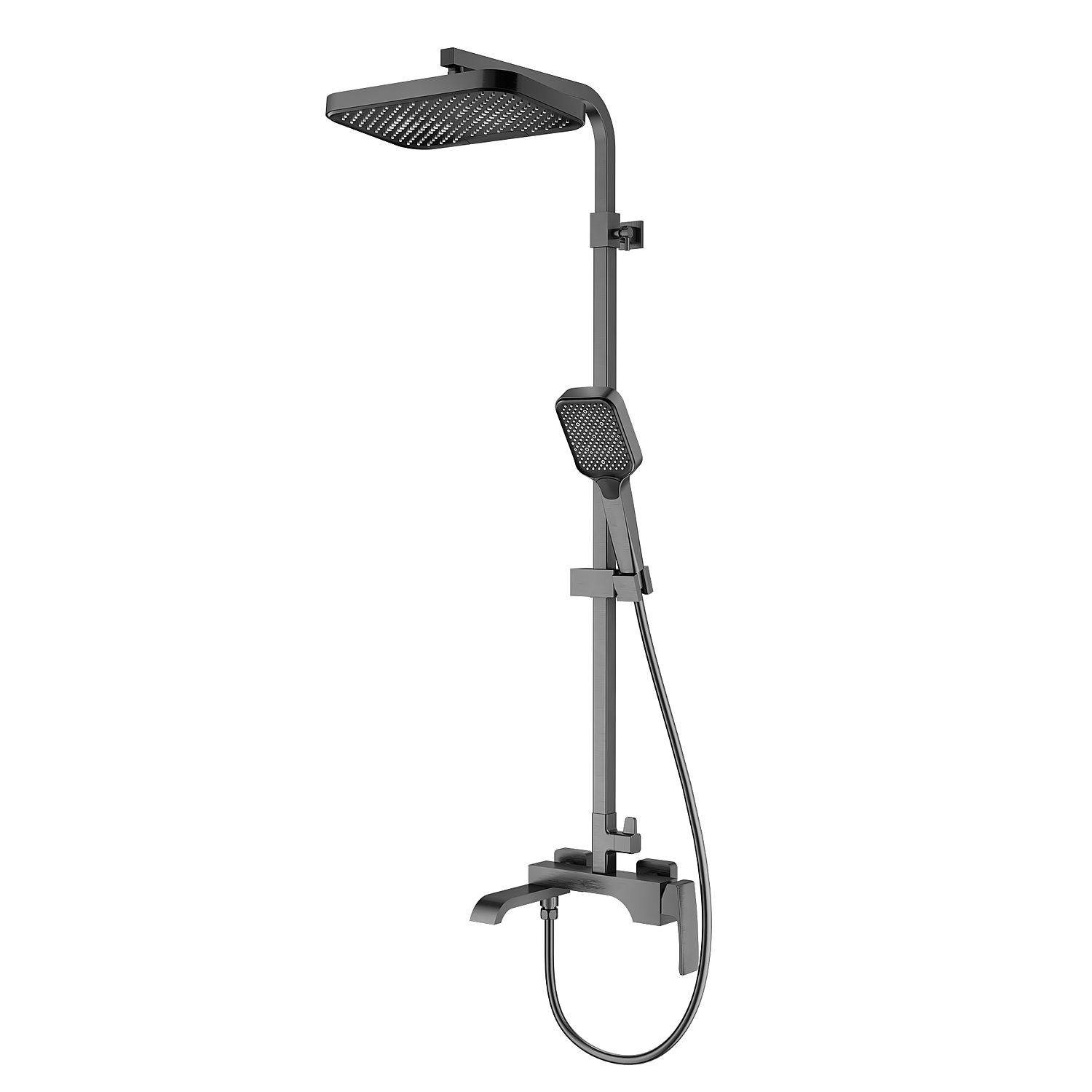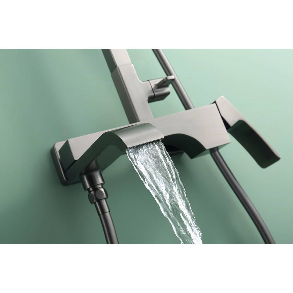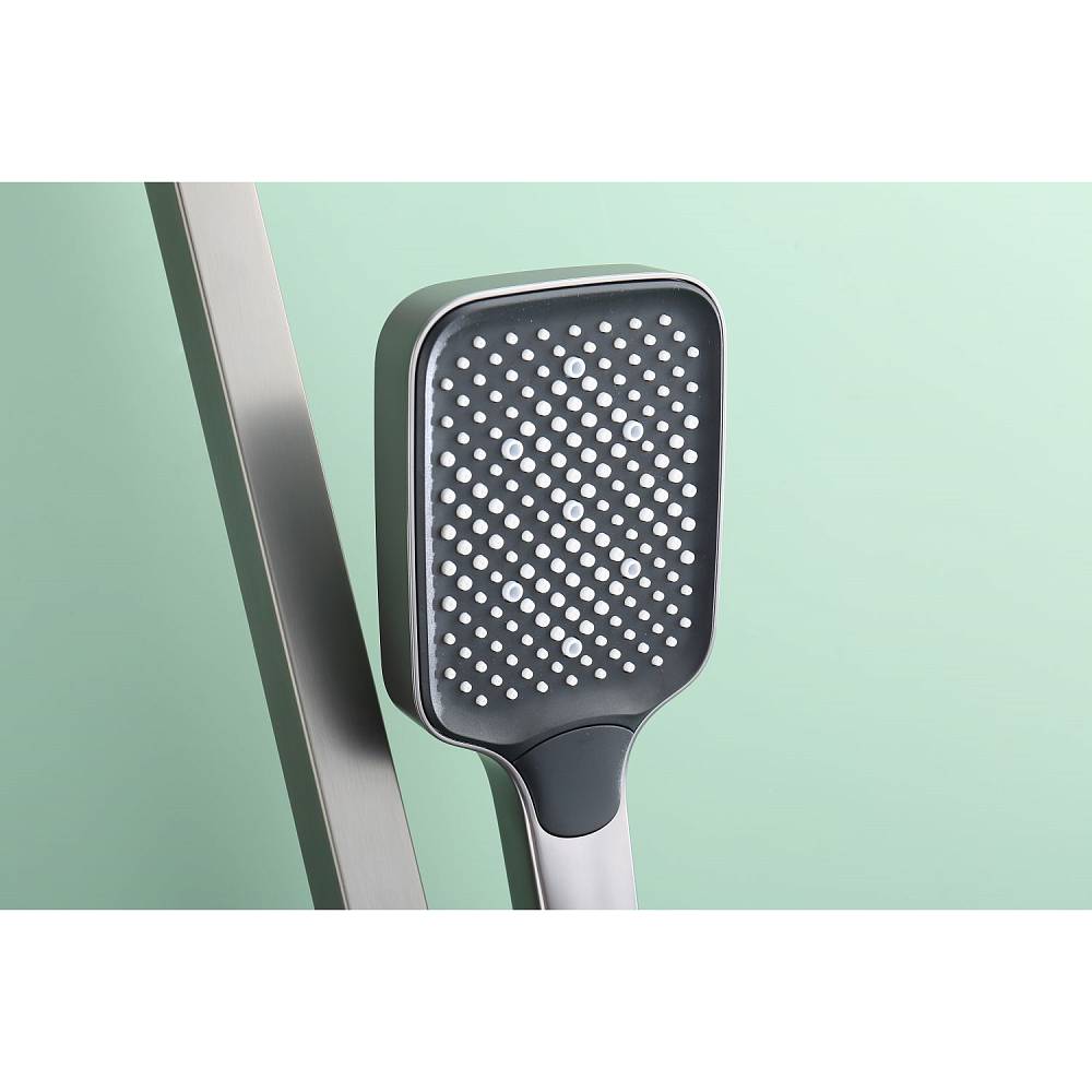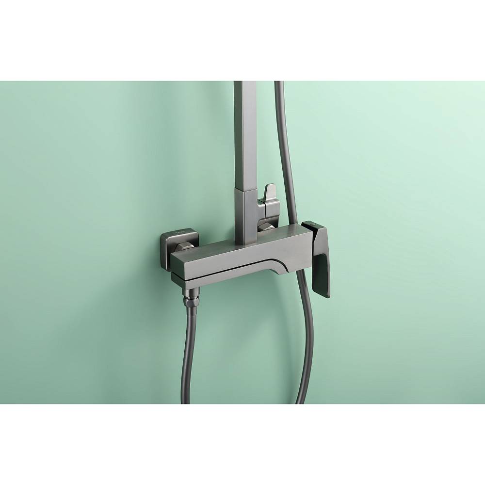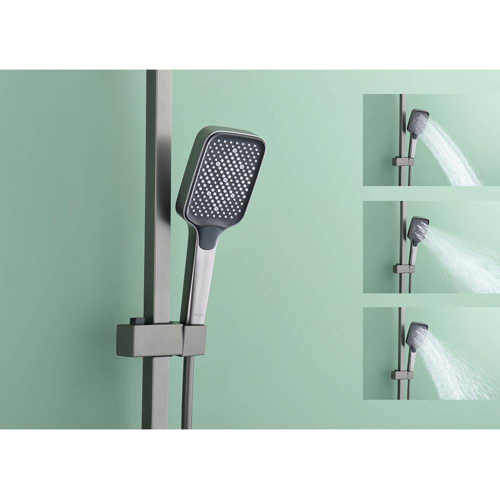 Душевая система Raglo R02.24.09 в цвете «графит» — это настенная модель с однорычажным смесителем, отличающаяся минималистичным дизайном и функциональностью. Основа из латуни гарантирует прочность и устойчивость к коррозии. Керамический картридж обеспечивает точное и плавное регулирование температуры и напора воды. В комплект включены: прямоугольный верхний душ (280 × 190 мм), ручной душ с тремя режимами струи (переключение кнопкой), металлический шланг длиной 1,5 м, регулируемая штанга, держатель для ручного душа и монтажные элементы (эксцентрики с отражателями). Излив каскадного типа имеет поворотную конструкцию (17 см), удобную для наполнения ванны. Система оснащена аэратором для равномерной подачи воды и антиизвестковым покрытием, упрощающим уход. Высота конструкции — 142 см, вылет верхнего душа — 37 см. Стандарт подводки — G 1/2, пропускная способность — до 44 л/мин.