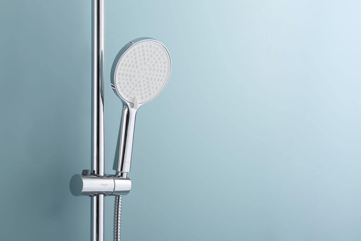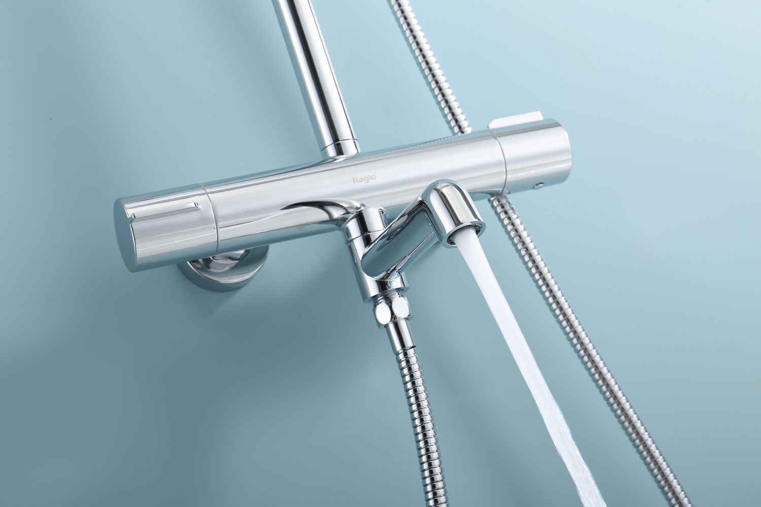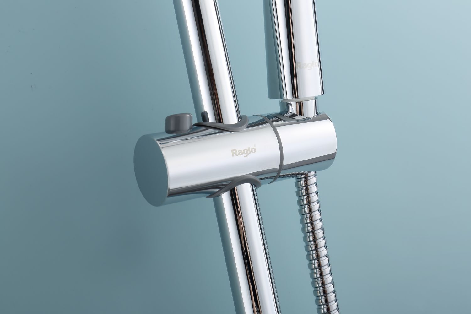 Душевая система Raglo R20.26 с термостатом в хромированном исполнении представляет собой стильное и функциональное решение для ванной комнаты. Конструкция изготовлена из высококачественной латуни, что обеспечивает её прочность, долговечность и устойчивость к коррозии, а хромированное покрытие придаёт элегантный внешний вид и защищает поверхность.