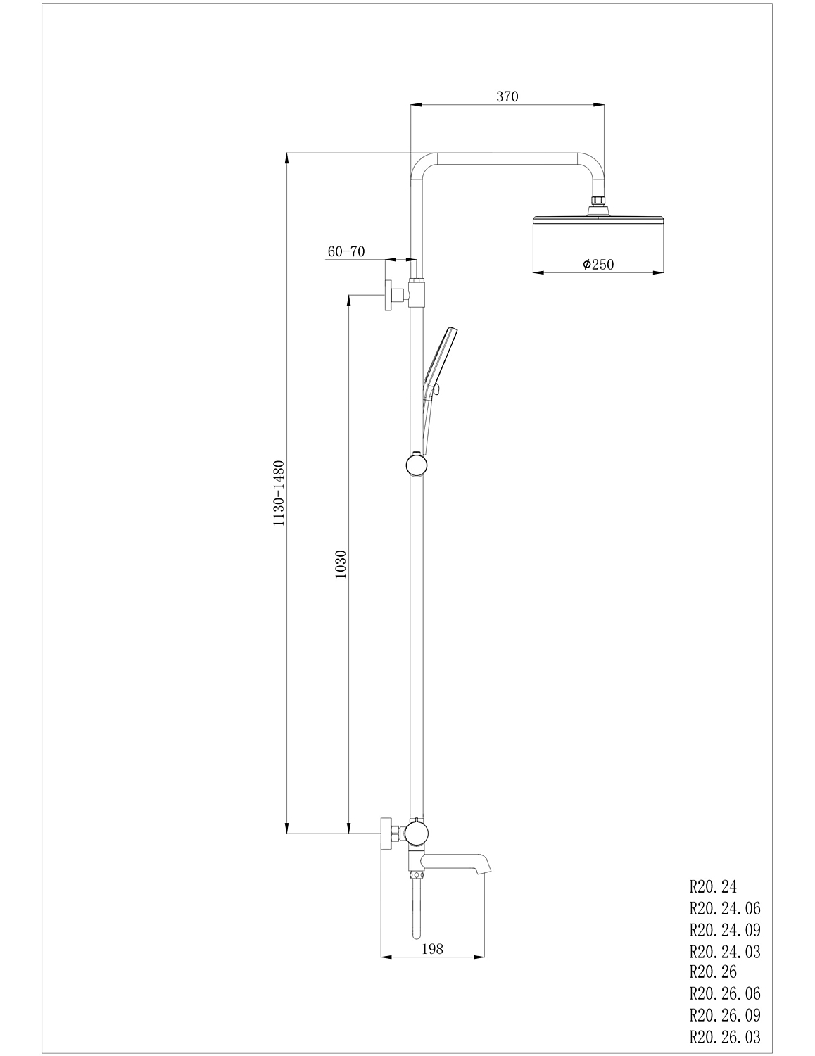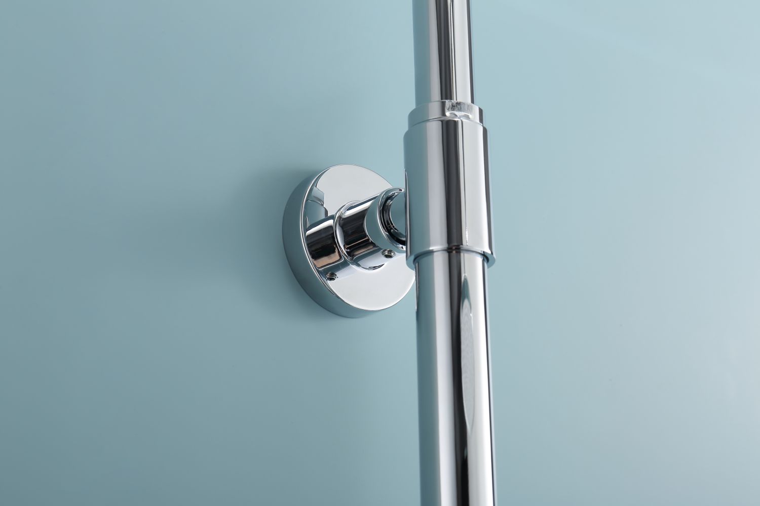 Высота душевой штанги регулируется в диапазоне 1130–1480 мм, что позволяет настроить положение верхнего и ручного душа под рост пользователей. Система монтируется на стену — для установки требуется три отверстия. Подключение выполняется через стандартную подводку G 1/2 (½ дюйма).