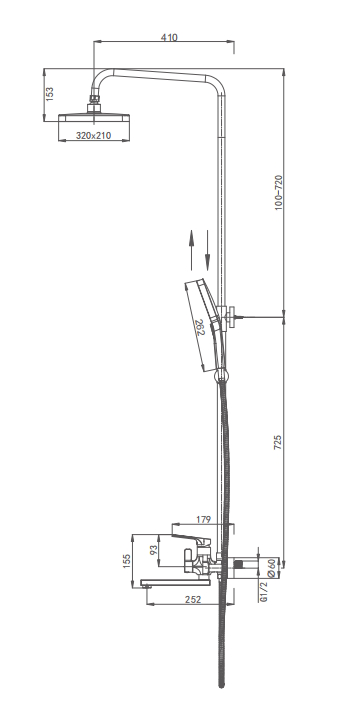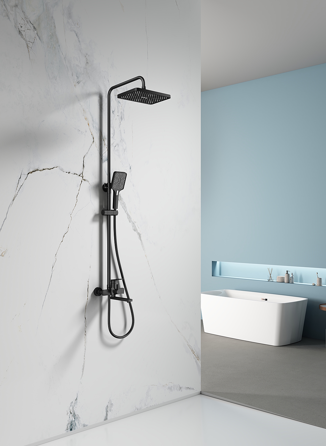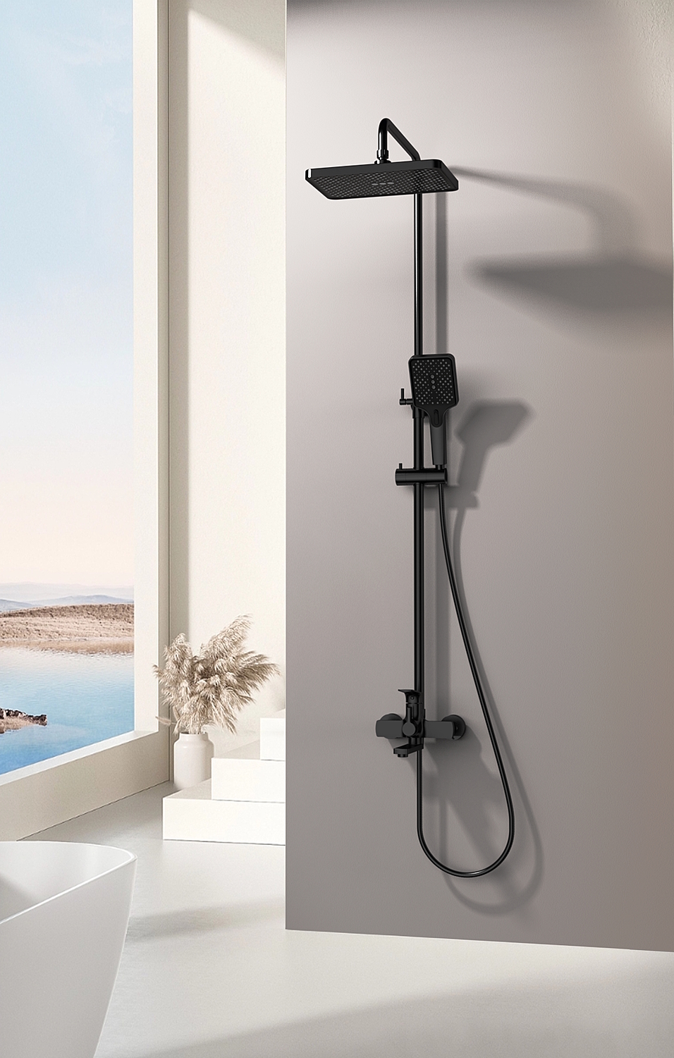 Душевая система Splenka S30.24.06 в чёрном цвете — это настенная модель с однорычажным управлением, сочетающая практичность и лаконичный дизайн. Конструкция изготовлена из латуни, гарантирующей надёжность и длительный срок службы. Регулировка температуры и напора воды выполняется с помощью керамического картриджа диаметром 30 мм. В комплект поставки входят: смеситель, прямоугольный верхний душ (320 × 210 мм), ручной душ с тремя режимами струи (кнопочное переключение), металлический душевой шланг длиной 1,5 м в двойной оплётке, регулируемая по высоте душевая штанга (диапазон 860–1480 мм), держатель ручного душа и монтажные элементы (эксцентрики с отражателями). Излив имеет каскадную форму и поворотную конструкцию длиной 18,2 см. Для комфортного использования предусмотрен аэратор, обеспечивающий равномерную подачу воды. Поверхность системы обработана антиизвестковым покрытием, препятствующим скоплению налёта. Переключение между режимами: для направления потока на ручной душ нужно повернуть дивертор на изливе на 90 градусов, управление верхним душем осуществляется отдельным рычагом в нижней части штанги. Высота конструкции — 151 см, вылет верхнего душа — 42 см. Стандарт подводки — G 1/2, пропускная способность — до 48 л/мин.