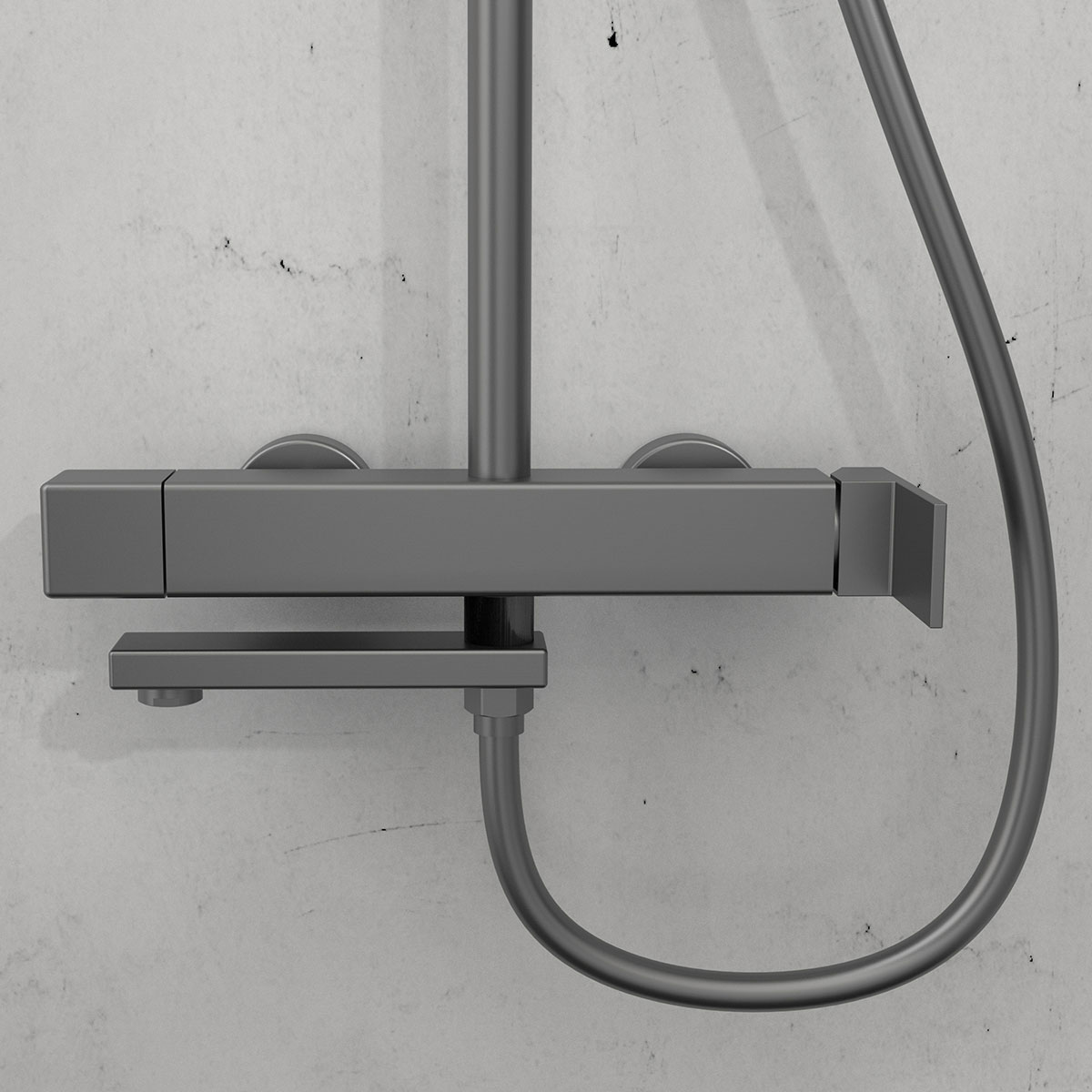 Душевая система Vincea Cube VSFS‑1C1GM выполнена в отделке «вороненая сталь», что придаёт изделию сдержанный матовый металлический облик. Комплект включает однорычажный смеситель, верхнюю лейку тропического душа и ручную лейку на гибком шланге. Конструкция предполагает настенное крепление и эргономичное управление потоком и температурой воды посредством рычажной рукоятки. Материал основных элементов — латунь с качественным покрытием «вороненая сталь»; шланг и штанга изготовлены из нержавеющей стали. Дизайн отличается чёткими геометрическими формами в духе современного минимализма, а матовая металлическая отделка устойчива к появлению отпечатков пальцев и мелких царапин.