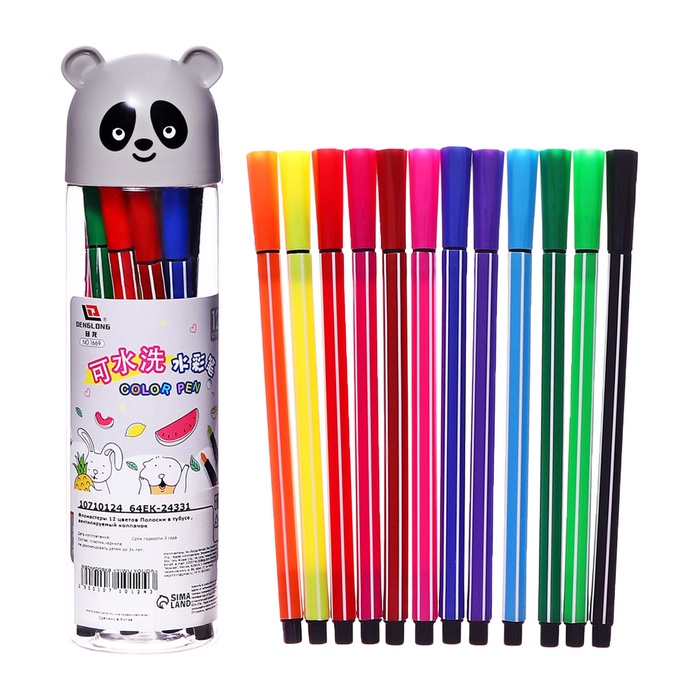 Фломастеры 12 цветов Полоски в тубусе Панда серая, вентилируемый колпачок