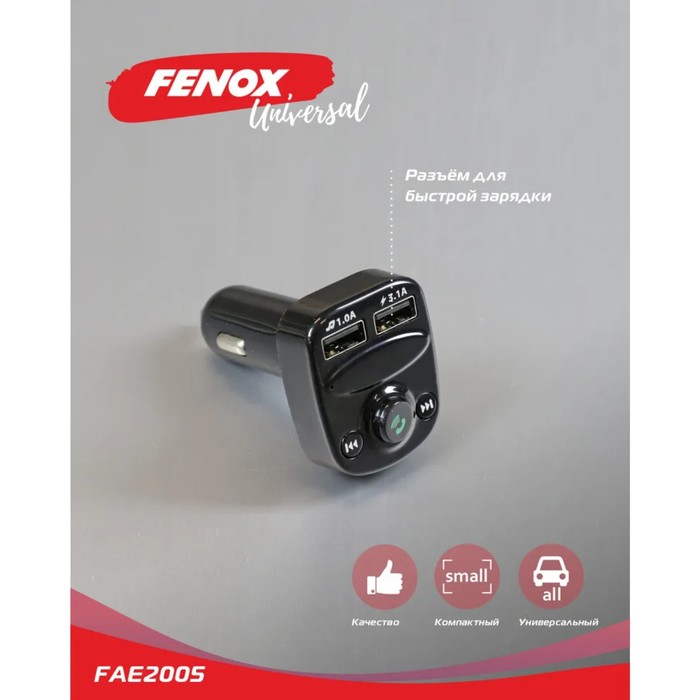 Универсальный FM модулятор FENOX FAE2005 предназначен для считывания и воспроизведения аудиозаписей с различных носителей на определенной настроенной частоте. Автомобильный FM-трансмиттер питается от автомобильного прикуривателя и способен проигрывать музыку с USB-флеш накопителя, SD карты или через Bluetooth со смартфона или ноутбука.