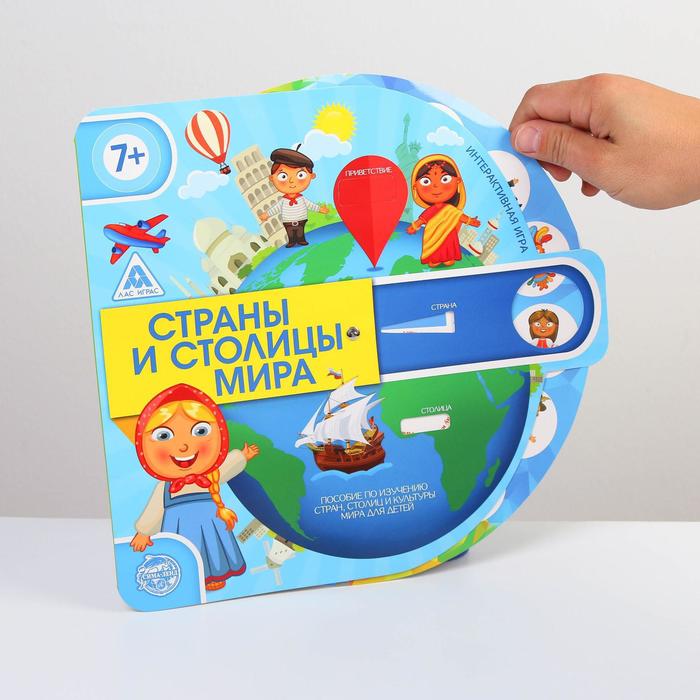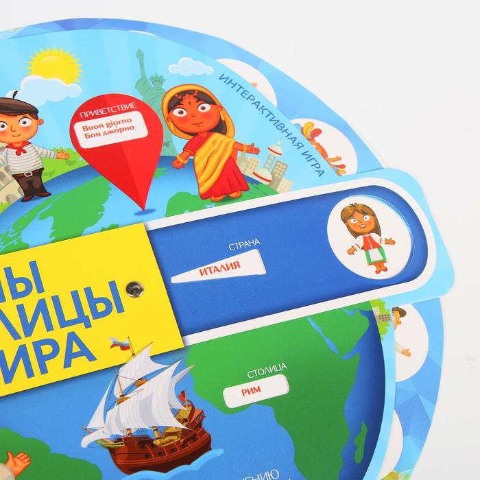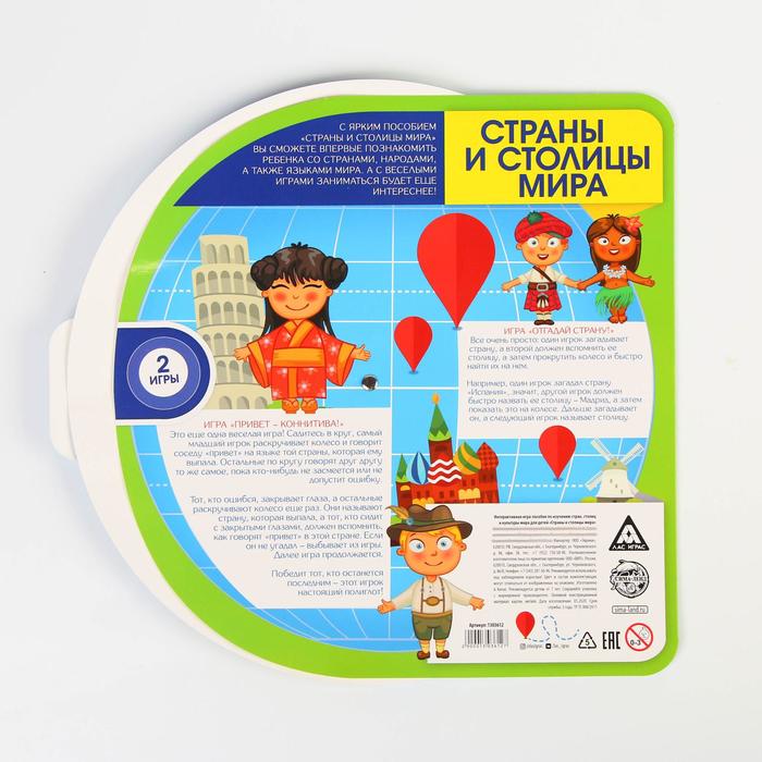 С этим необычным пособием вы познакомите ребёнка с народами мира! Крутите колесо и в выпавших секторах вы найдёте страну, столицу, а также приветствие её жителей. Красочные иллюстрации дают представление о разных национальных костюмах. Узнавайте новое!