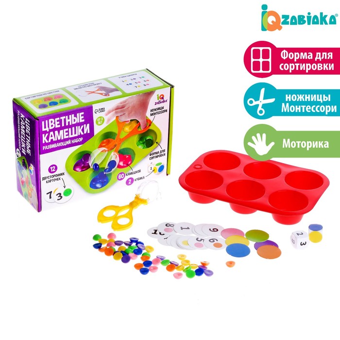 В комплект входит форма для сортировки, 12 карточек с заданиями, 60 камешков, 2 кубика.