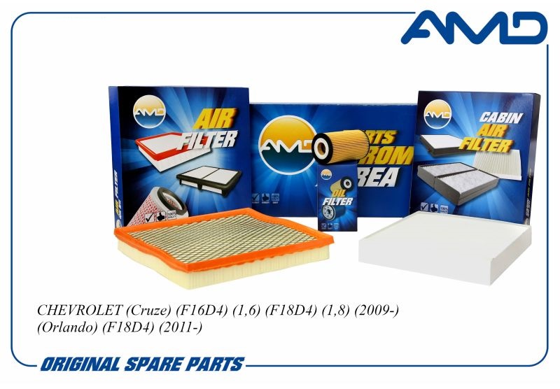 Комплект фильтров AMD.SETF49 (масляный 93185674 + воздушный 13272717 + салонный 13271190). Применимость: CHEVROLET (Cruze J300) (F16D4) (1,6) (F18D4) (1,8) (2009-) (Orlando) (F18D4) (2011-).