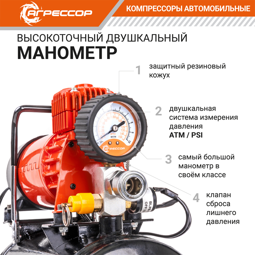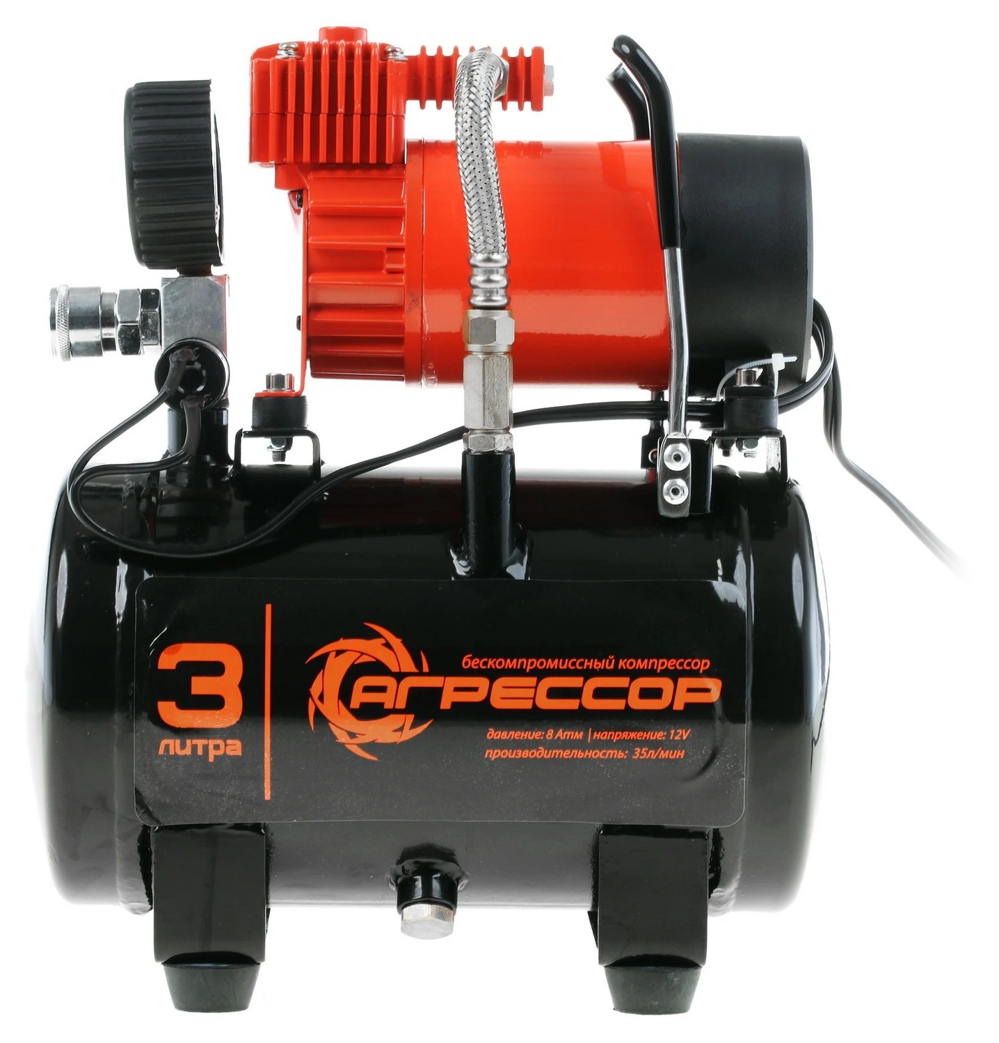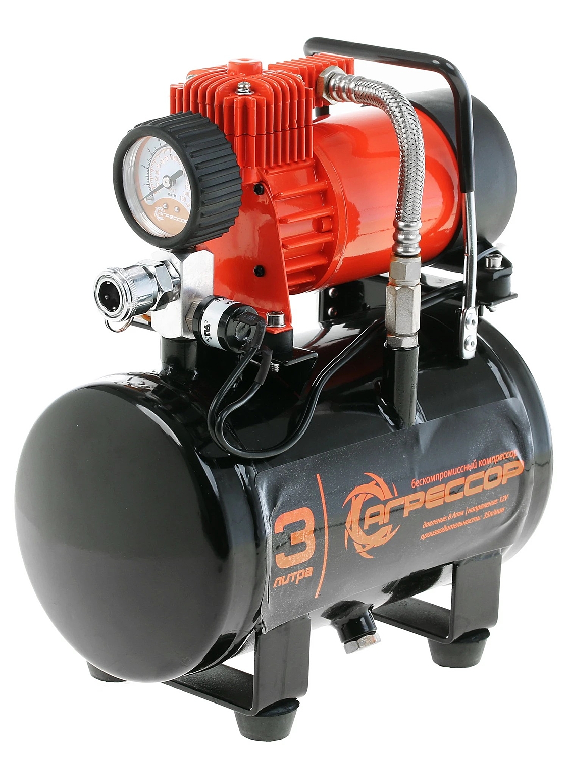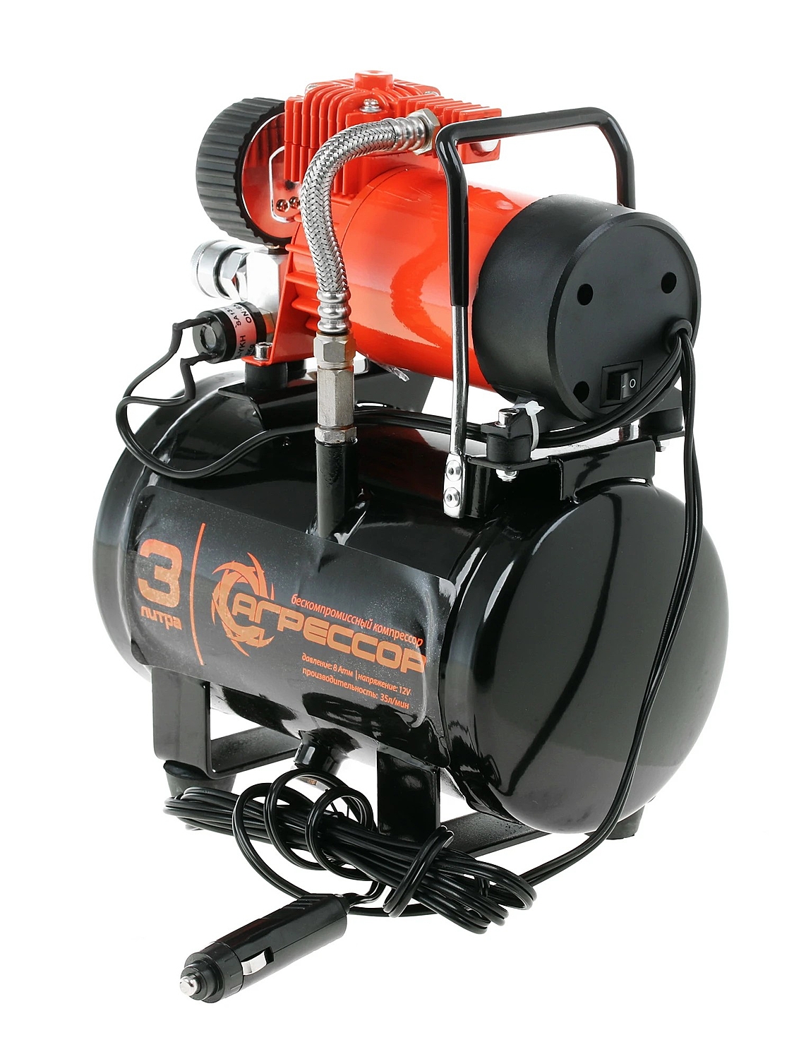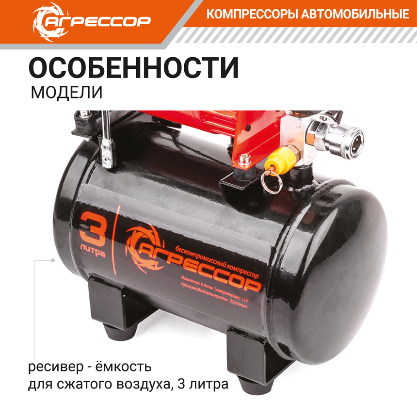 Автомобильный компрессор Агрессор AGR-3LT с ресивером предназначен для накачивания шин легковых автомобилей и кроссоверов. Имеет производительность 35 л/мин и создаёт максимальное давление 8 Атм. Подключается к розетке прикуривателя и к клеммам АКБ через переходник из комплекта поставки.