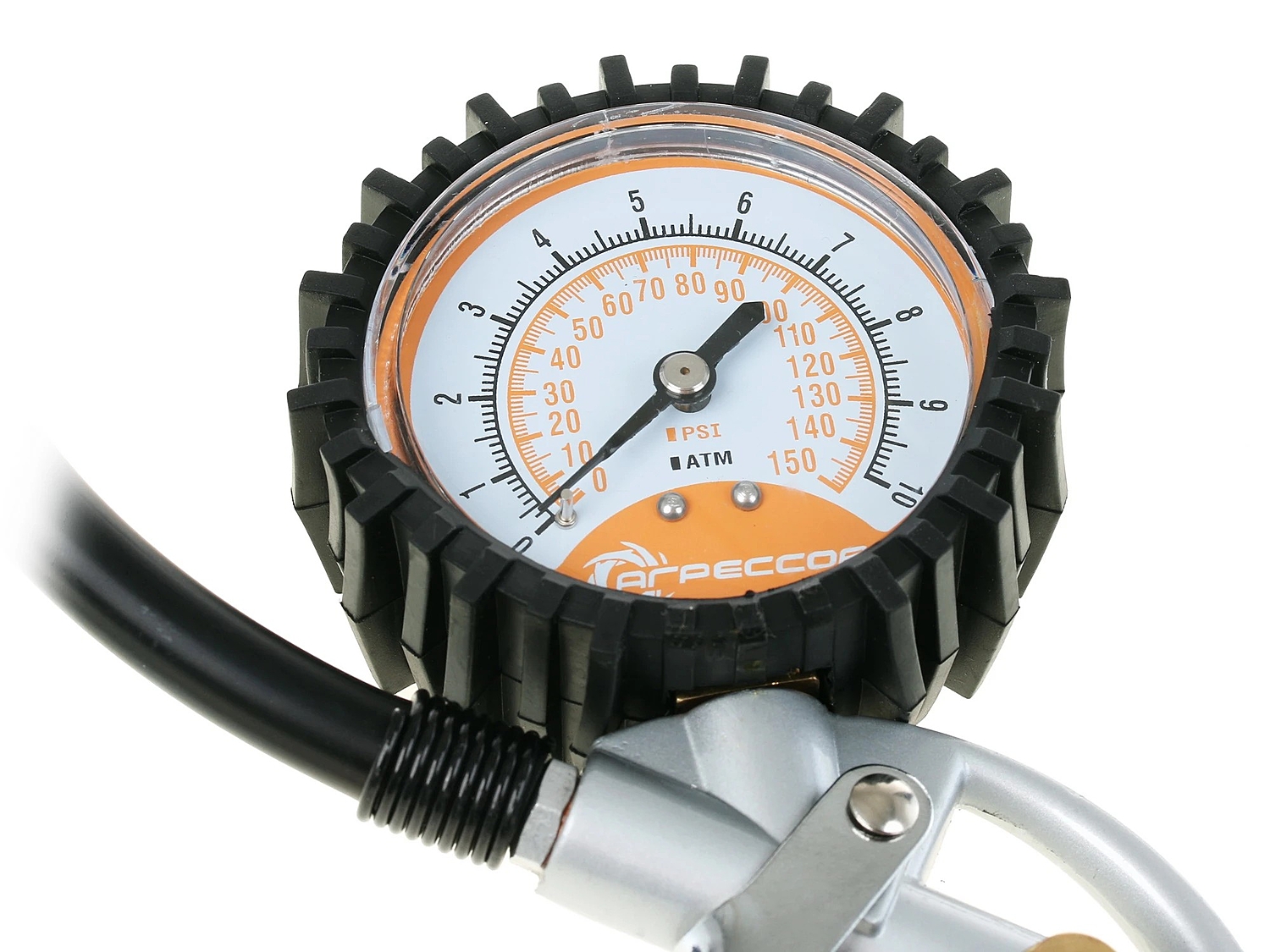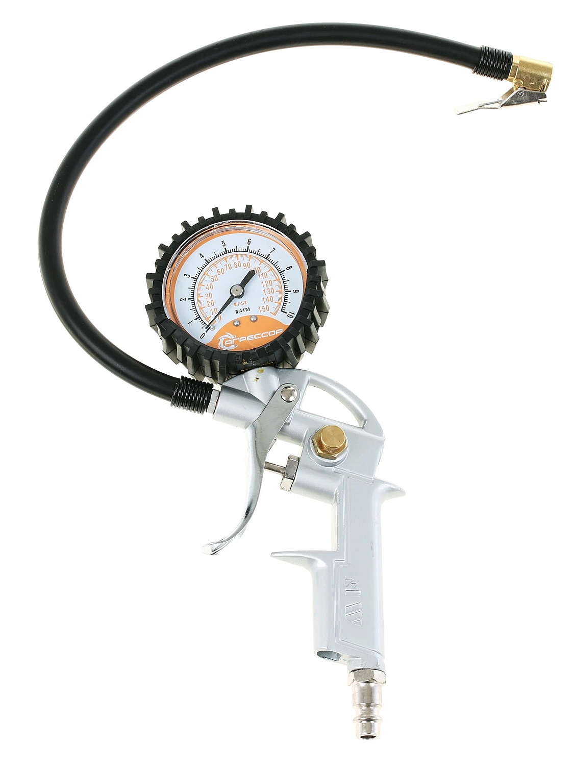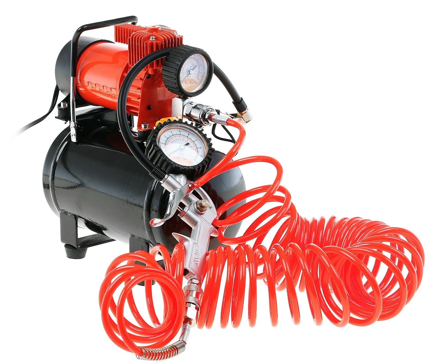 Компрессор комплектуется гибким шлангом длиной 10 метров, изготовленным из морозостойкой армированной резины. В «пистолет» встроены двушкальный манометр и перепускной клапан, предназначенный для выравнивания давления в шинах.