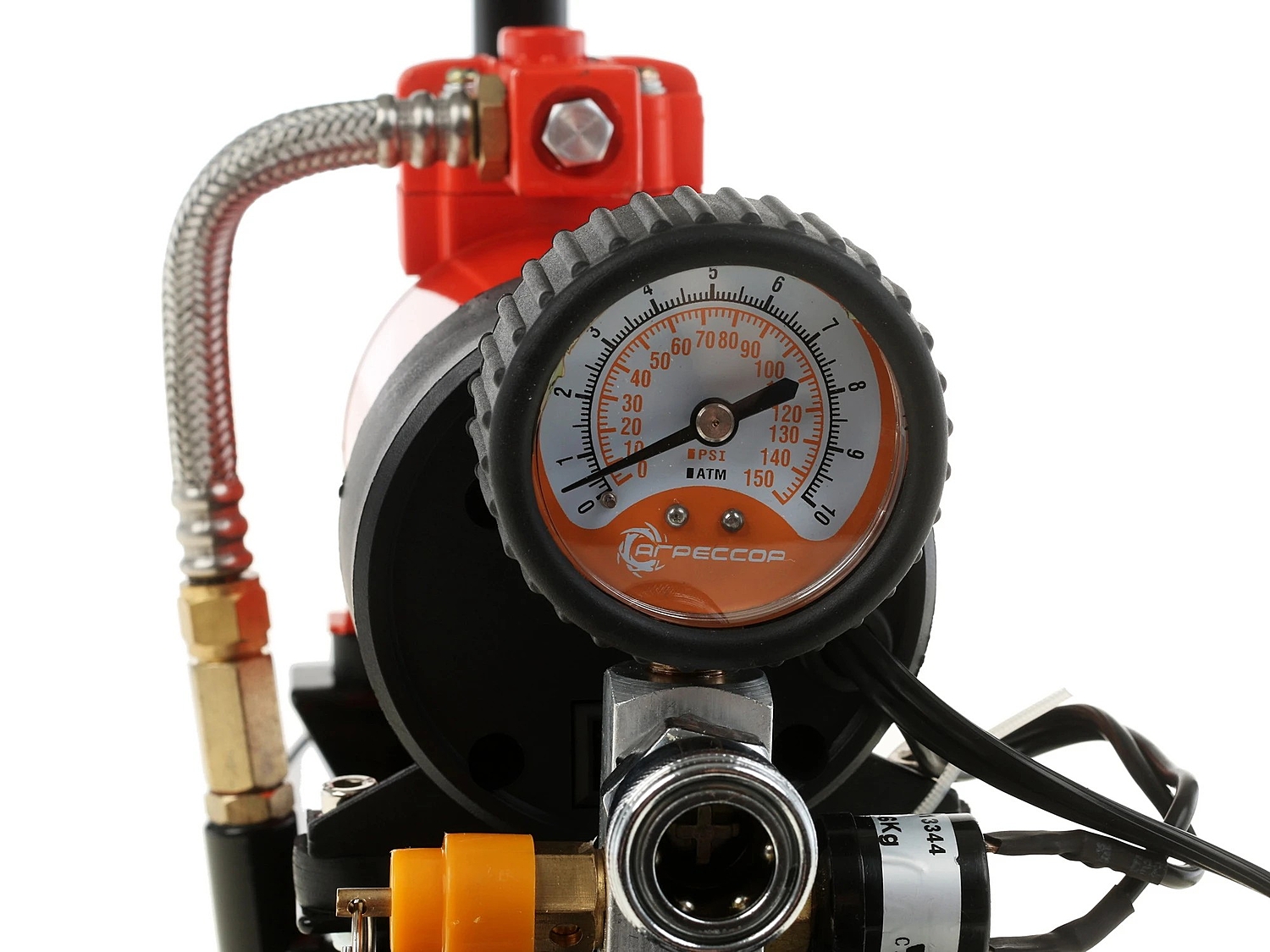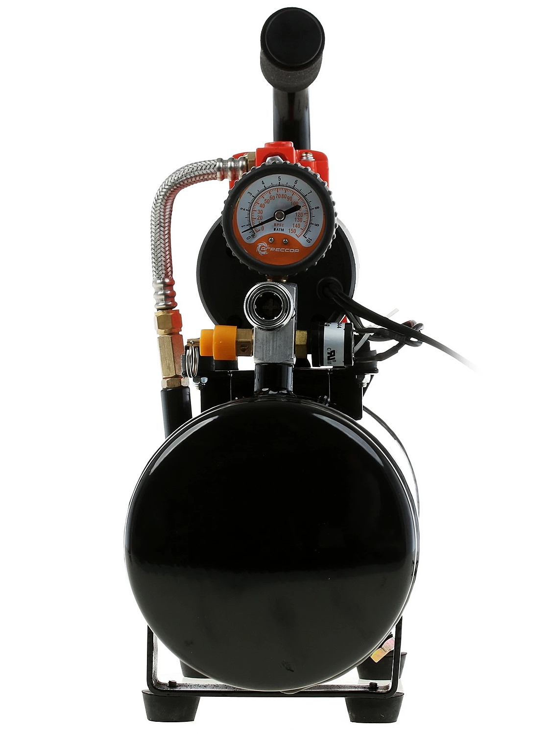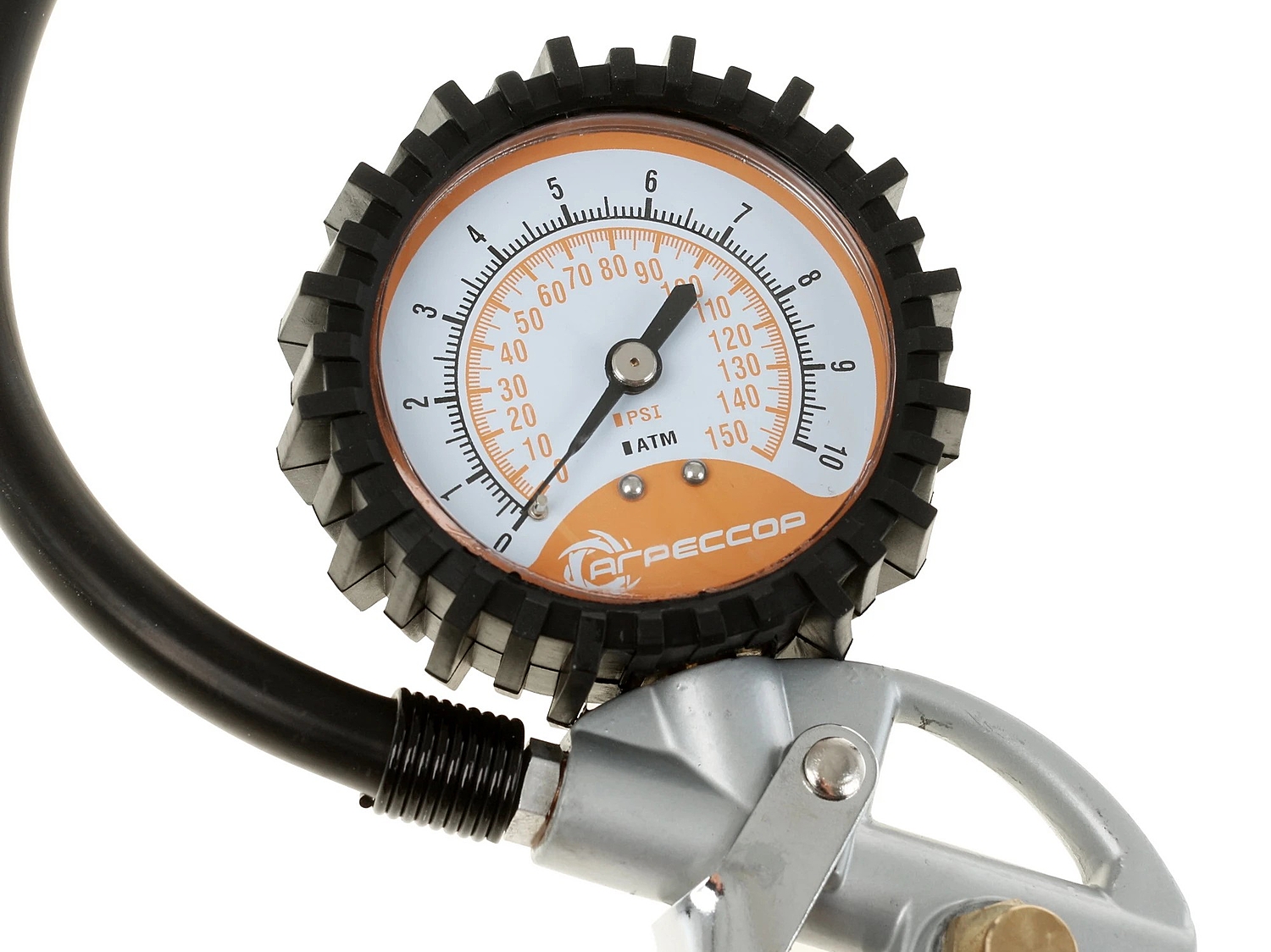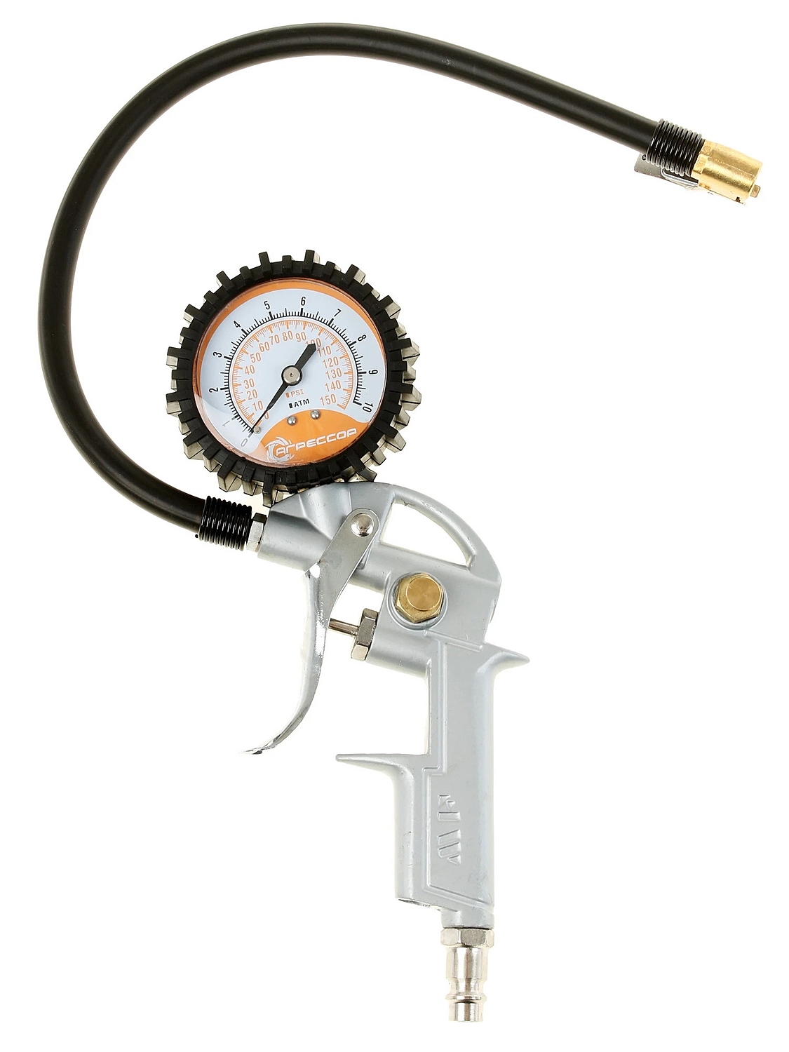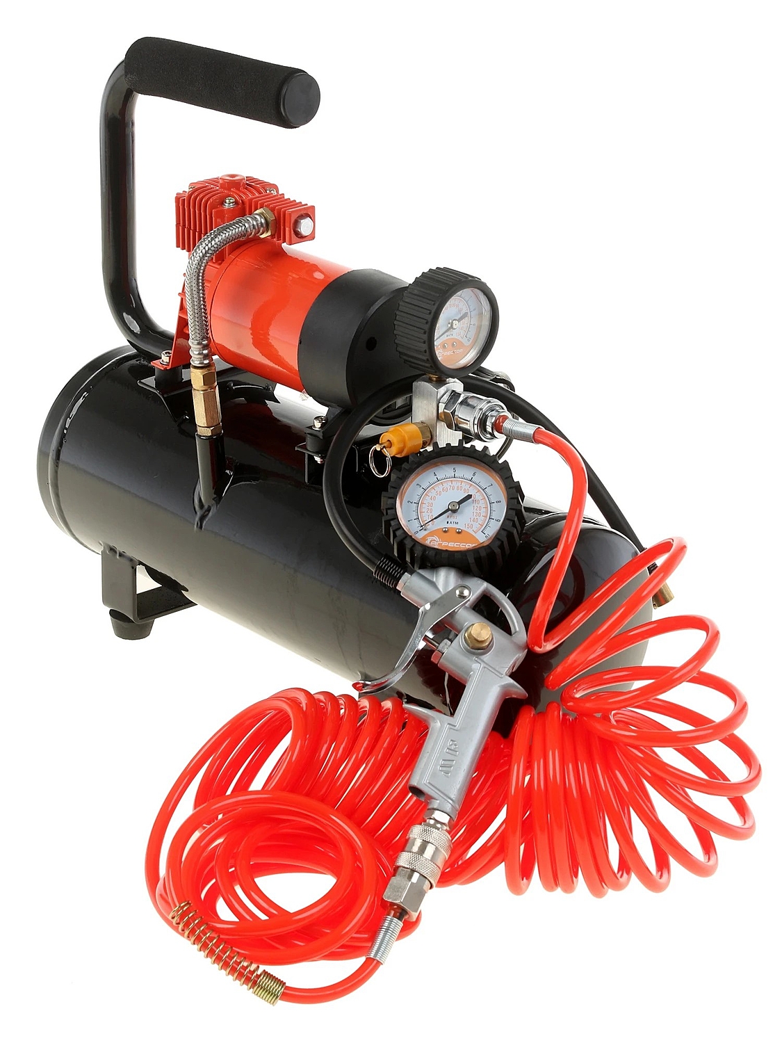 Компрессор комплектуется гибким шлангом длиной 10 метров, изготовленным из морозостойкой армированной резины. В «пистолет» встроены двушкальный манометр и перепускной клапан, предназначенный для выравнивания давления в шинах.