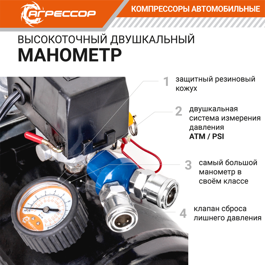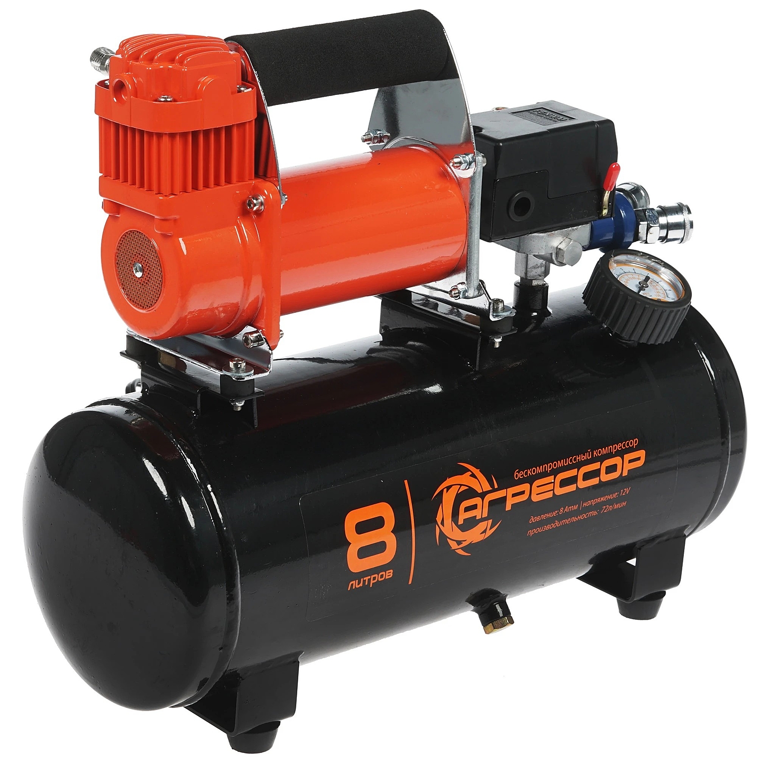 Автомобильный компрессор Агрессор AGR-8LT с ресивером предназначен для накачивания шин легковых автомобилей и кроссоверов. Имеет производительность 72 л/мин и создаёт максимальное давление 8 Атм.