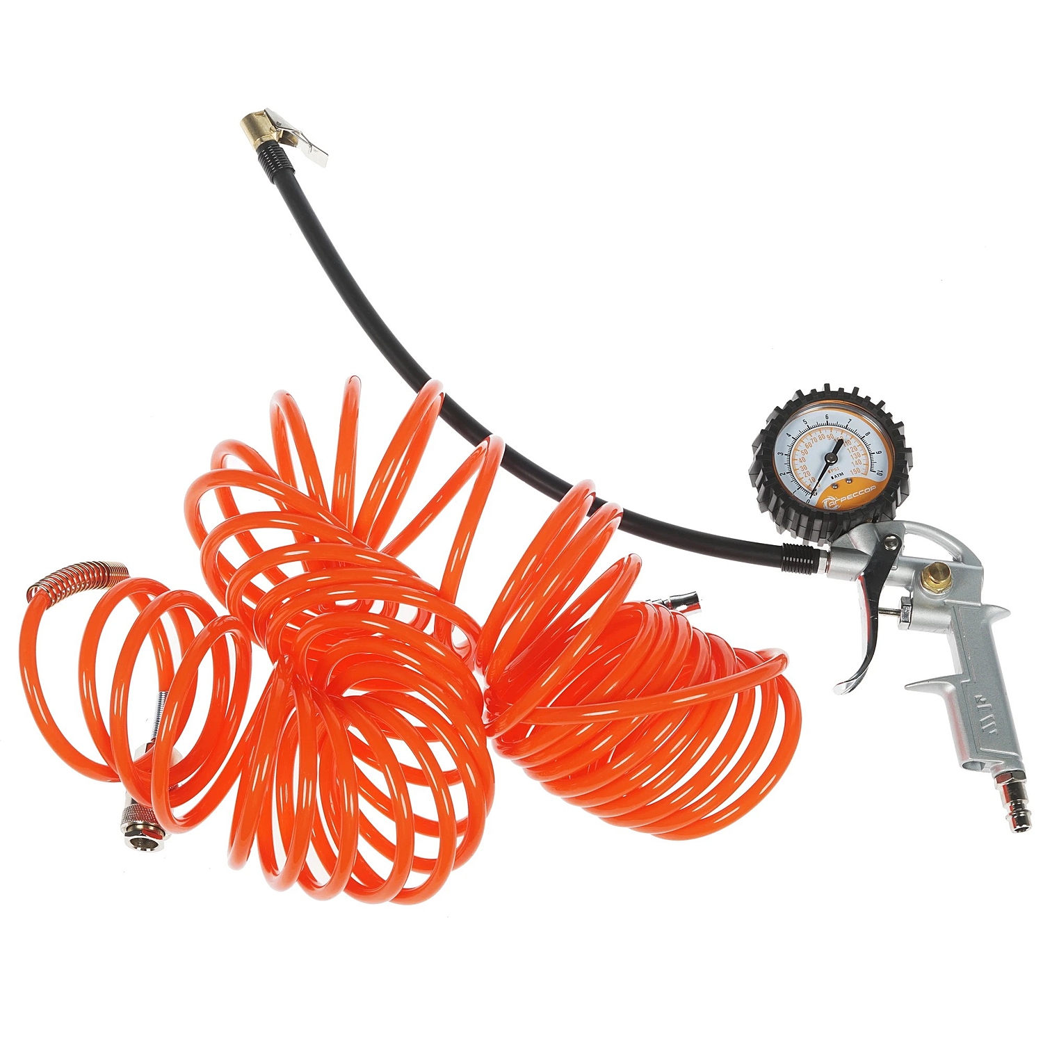 Компрессор комплектуется гибким шлангом длиной 10 метров, изготовленным из морозостойкой армированной резины. В «пистолет» встроены двушкальный манометр и перепускной клапан, предназначенный для выравнивания давления в шинах.