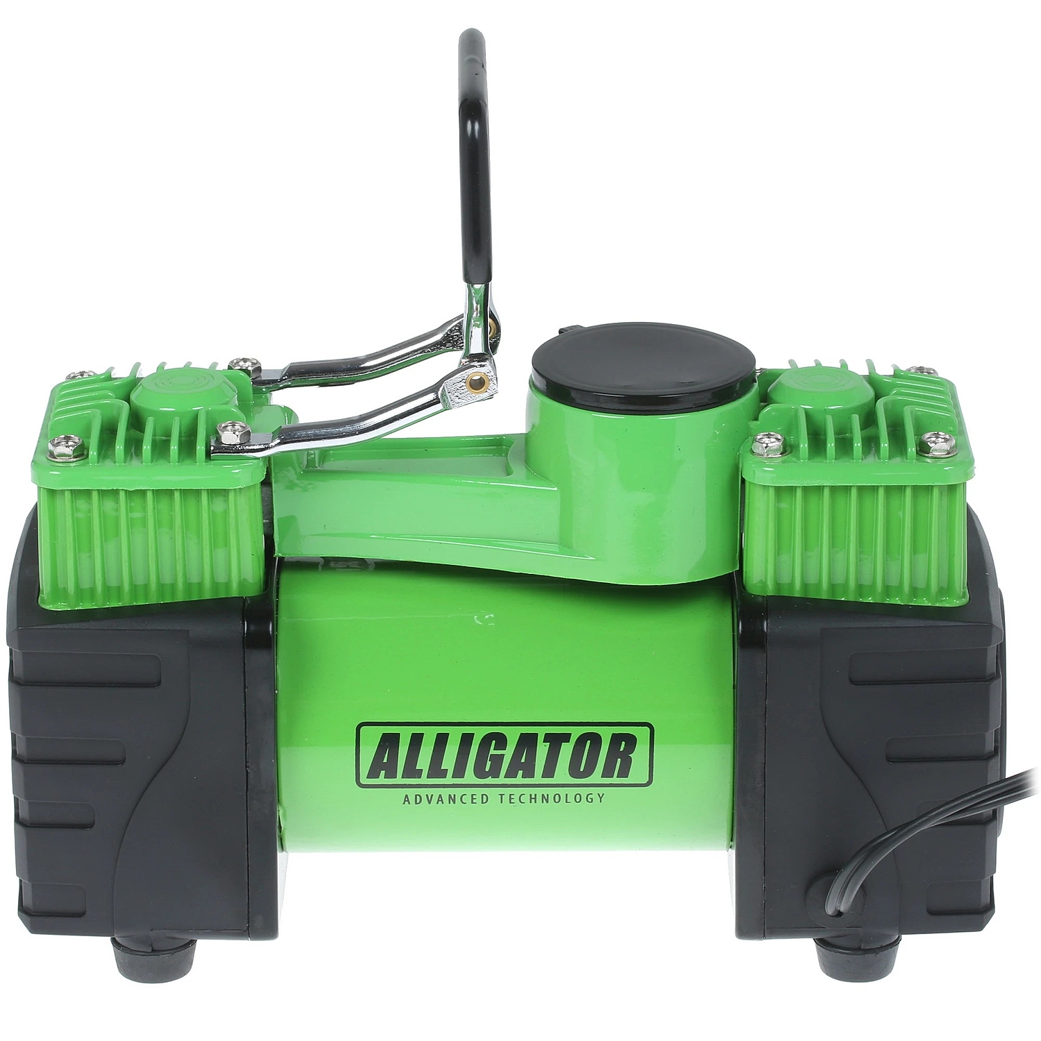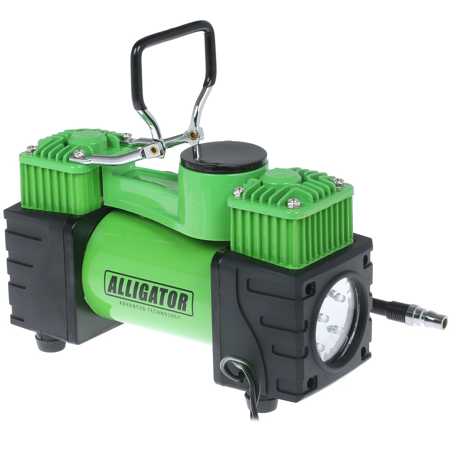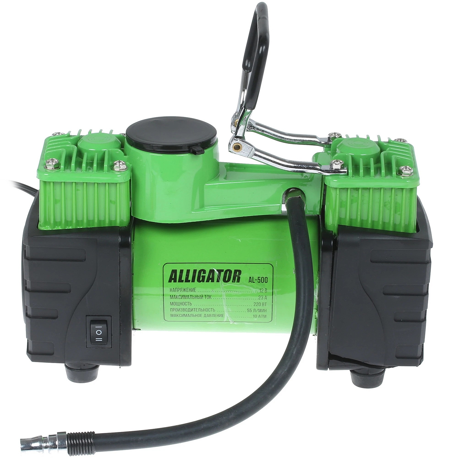 Самая мощная модель серии Alligator — двухпоршневой компрессор AL-500. Особенности модели: встроенный фонарь, защита от перегрева, шланг-удлинитель длиной 4 м. Два поршня распределяют нагрузку и тем самым снижают износ электродвигателя. Корпус модели сделан из высококачественного металла. Питание компрессора осуществляется от аккумулятора автомобиля, к которому он подключается через зажимы АКБ.