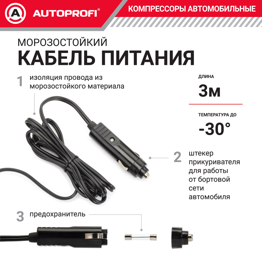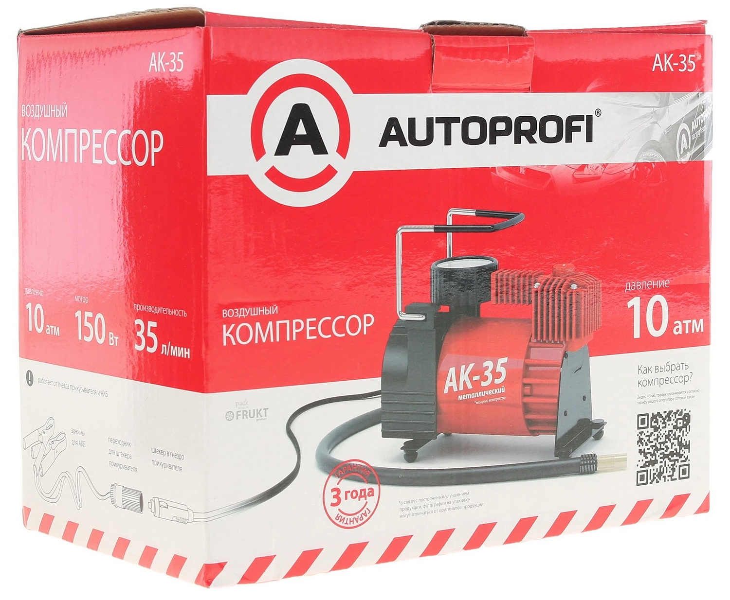 Автомобильный компрессор Autoprofi AK-35 предназначен для накачивания колёс легковых автомобилей, кроссоверов, внедорожников, а также лёгкого коммерческого транспорта. Имеет производительность 35 л/мин и создаёт максимальное давление 10 Атм. Подключается к розетке прикуривателя и к клеммам АКБ через переходник из комплекта поставки.