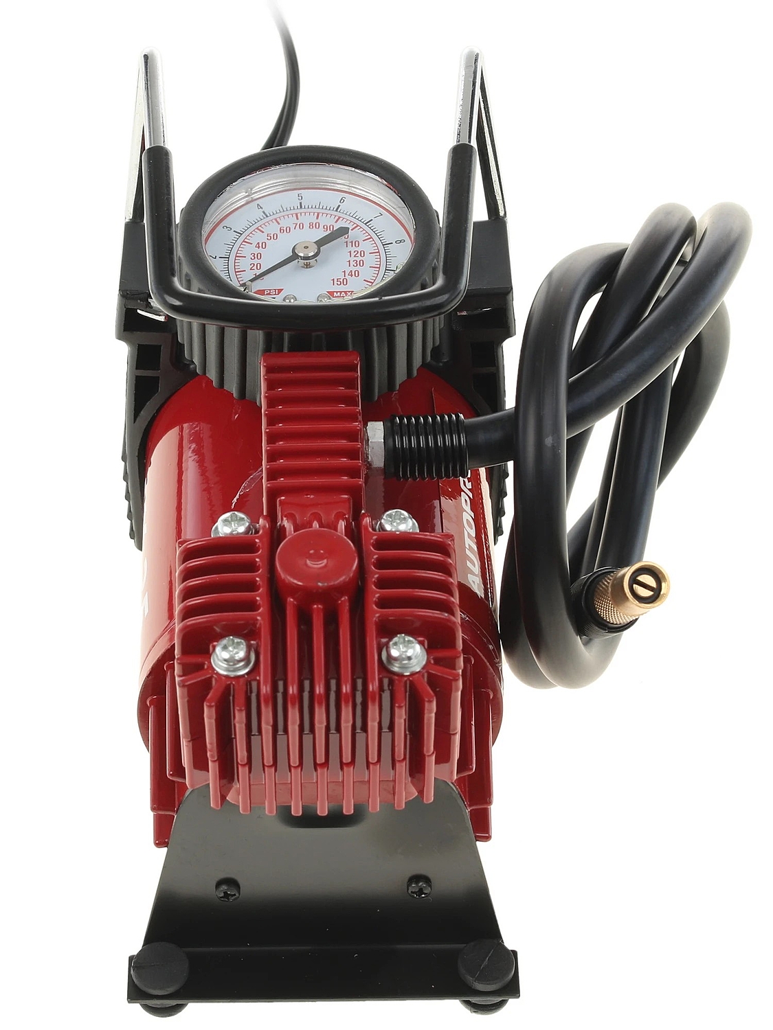Компрессор комплектуется гибким шлангом длиной 1 метр, изготовленным из морозостойкой армированной резины. Манометр имеет защитный кожух.