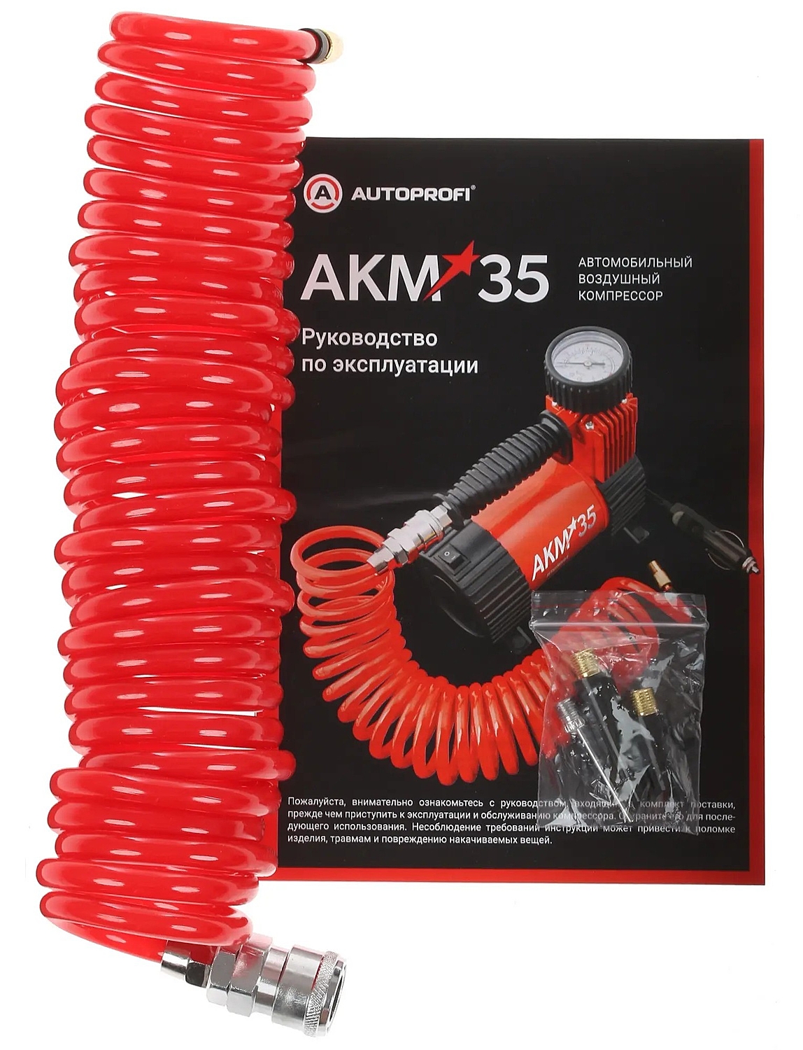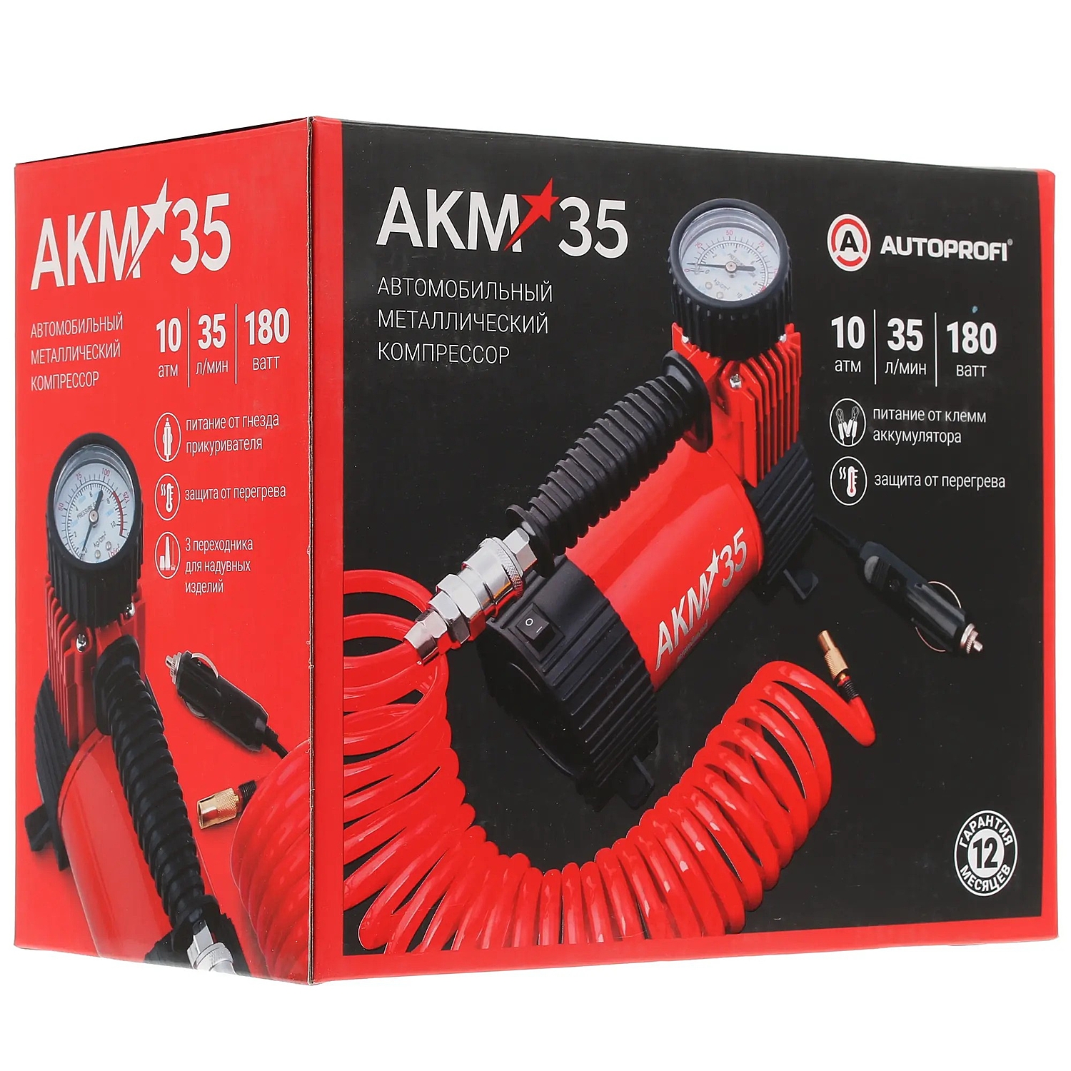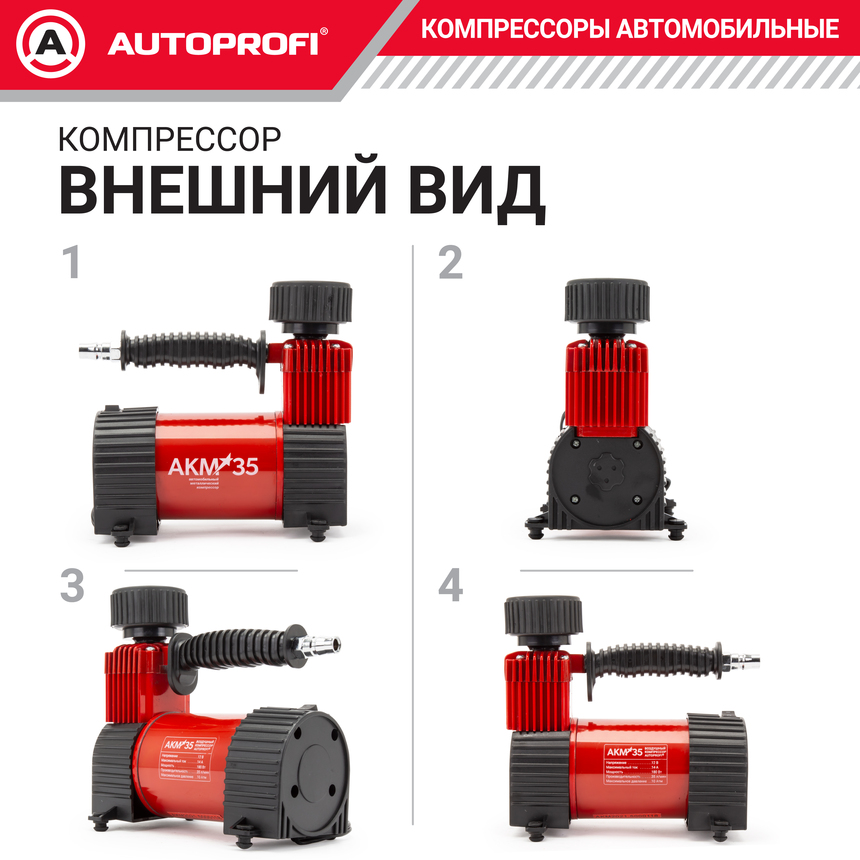 Компрессор Autoprofi АКМ-35 оборудован защитой от перегрева, точным двушкальным манометром, быстросъемным шлангом, кабелем питания 3 метровой длины и удобной сумкой для хранения и переноски. Компрессор позволяет полностью удовлетворить ожидания потребителей, которые ищут «золотую середину», при этом оставаясь полноценными компрессорами для накачивания шин автомобилей, велосипедов и других надувных изделий.