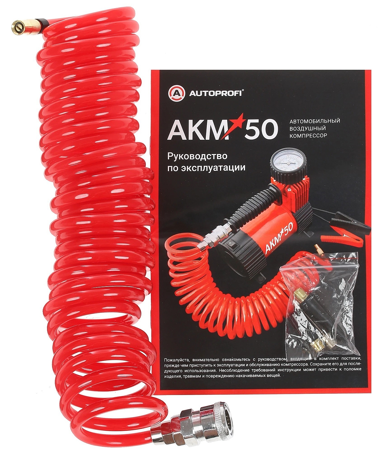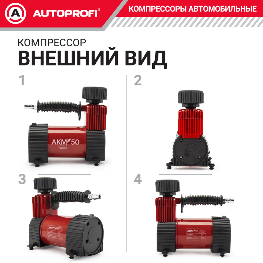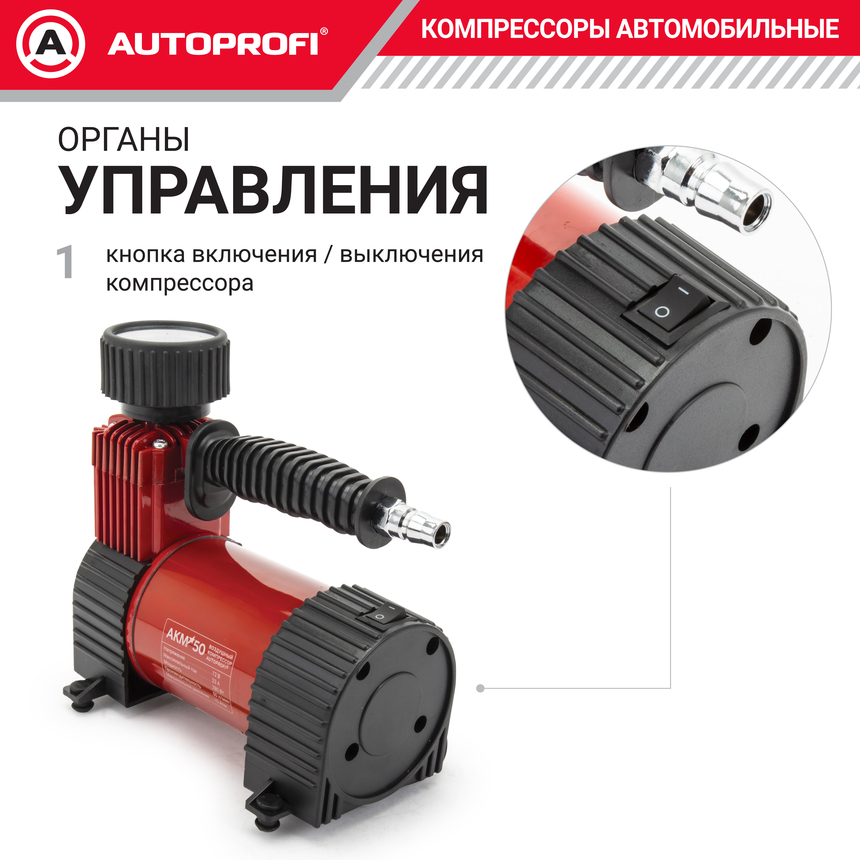 Компрессор Autoprofi АКМ-50 оборудован защитой от перегрева, точным двушкальным манометром, быстросъемным шлангом, кабелем питания 3 метровой длины и удобной сумкой для хранения и переноски. Компрессор позволяет полностью удовлетворить ожидания потребителей, которые ищут «золотую середину», при этом оставаясь полноценными компрессорами для накачивания шин автомобилей, велосипедов и других надувных изделий.
