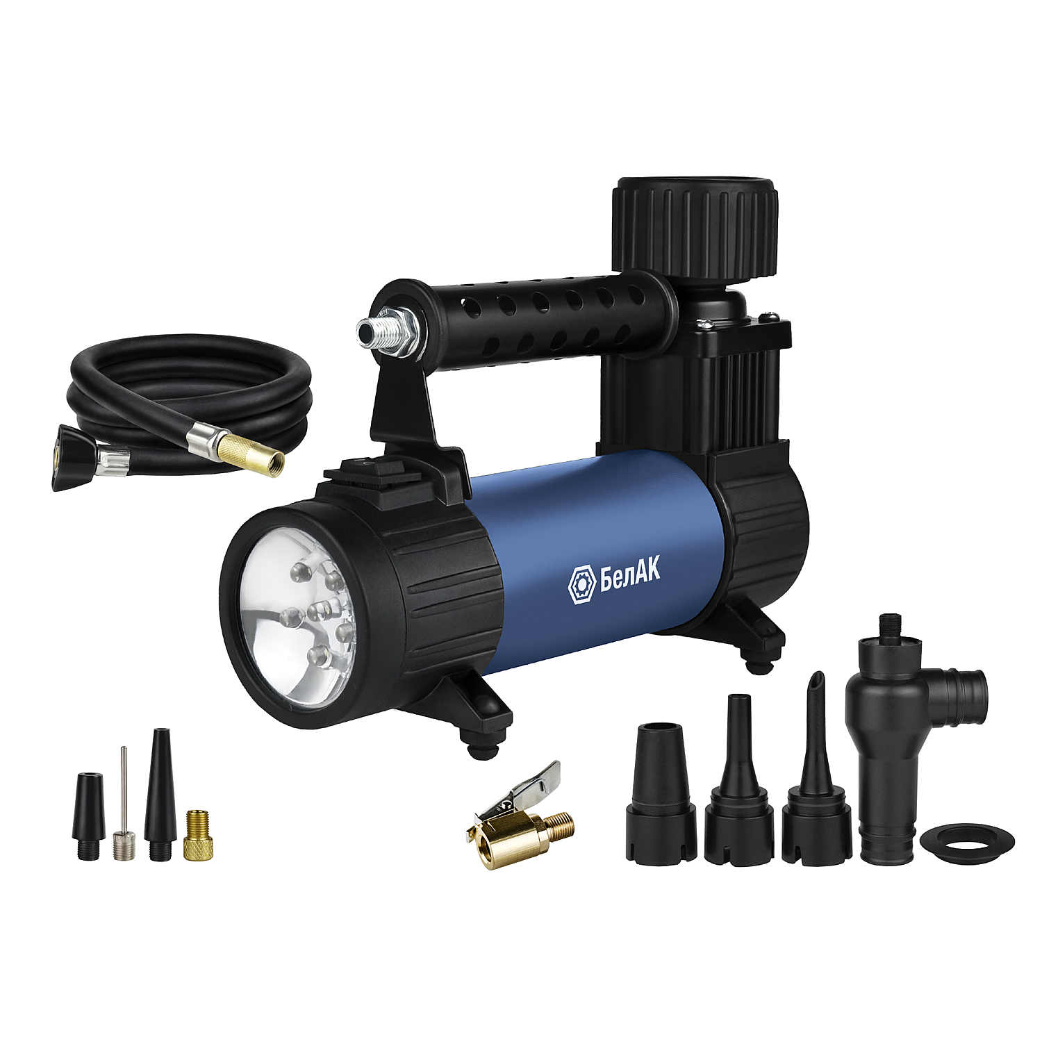 В комплекте: компрессор, сумка, съемный шланг, 4 сменных наконечника, 5 переходников, инструкция, коробка.