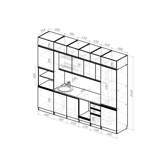 Кухонная мойка, стеновая панель, решётка посудосушителя в комплект не входят.