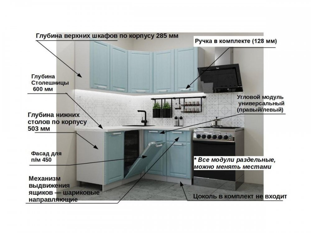 Кухонный гарнитур 15Р РоялВуд Голубой Прованс 2 размером 1450×1400 мм — угловой модульный гарнитур в классическом стиле прованс, создающий уютную атмосферу за счёт изящного дизайна с фрезеровкой «Прованс 2». Габариты: высота — 214 см, первая ширина — 145 см, вторая ширина — 140 см, глубина — 60 см. Корпус выполнен из ЛДСП (цвет белый), фасады — из МДФ с фрезеровкой (цвет РоялВуд Голубой), столешница — цвета Сахара толщиной 26 мм. Гарнитур оснащён шариковыми направляющими для ящиков и ручками модели С 42 в цвете «белый металлик». В комплект входят ручки, ножки, петли и элементы крепления, но не включены кухонная мойка, стеновая панель, посудосушитель и планки для столешницы — их нужно приобретать отдельно.