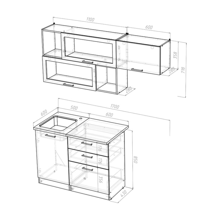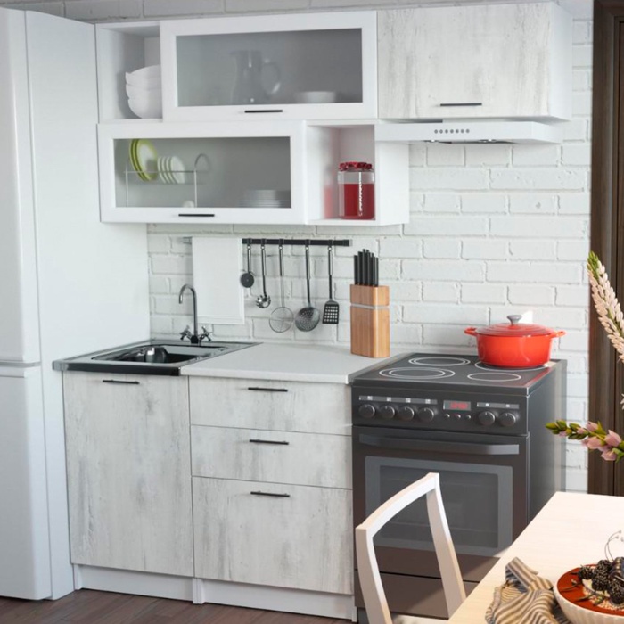 Кухонная мойка, стеновая панель, решётка для посудосушителя, приобретаются отдельно.
