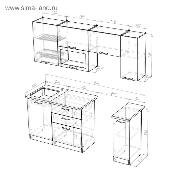 Кухонная мойка, стеновая панель, решётка для посудосушителя, приобретаются отдельно.