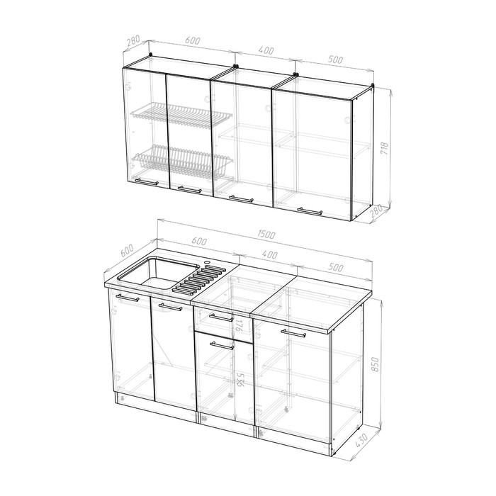 Кухонная мойка, стеновая панель, решётка для посудосушителя, приобретаются отдельно.