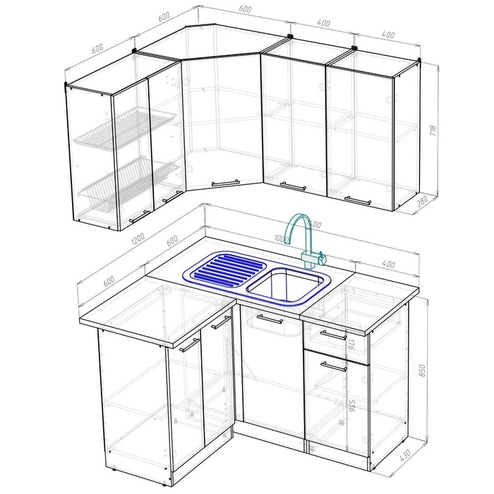 • Кухонная мойка, стеновая панель, посудосушитель в комплект не входят.