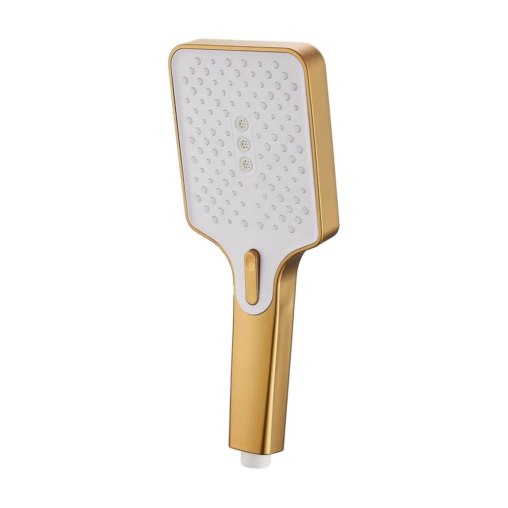Душевая лейка (ручной душ) BELZ BS02-5 в цвете брашированное золото — это стильное и функциональное решение для вашей ванной комнаты. Её современный дизайн и прямоугольная форма придают интерьеру уникальность и элегантность. Лейка изготовлена из прочного ABS-пластика, что гарантирует долговечность и устойчивость к повреждениям. Особенностью модели является наличие трёх режимов струи, которые позволяют настроить душ под индивидуальные предпочтения и создать оптимальные условия для релаксации. Форсунки, изготовленные из силикона, легко очищаются от известкового налёта, что обеспечивает постоянную эффективность и гигиеничность. Стандарт подключения 1/2" делает душевую лейку совместимой с большинством душевых шлангов, что обеспечивает удобство при установке и использовании.