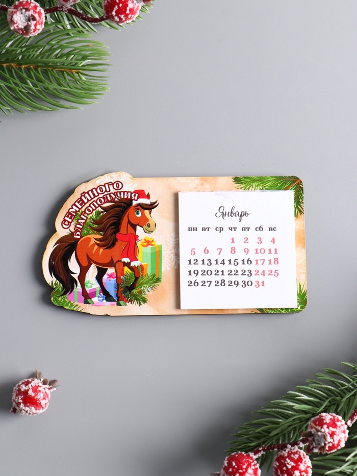 Этот магнит с символом 2026 года станет тёплым пожеланием семейного счастья и гармонии. Он создаёт в доме атмосферу уюта, напоминая о самом важном каждый раз, когда вы смотрите на холодильник. Календарь на весь год помогает легко планировать дела и значимые события для всей семьи.
