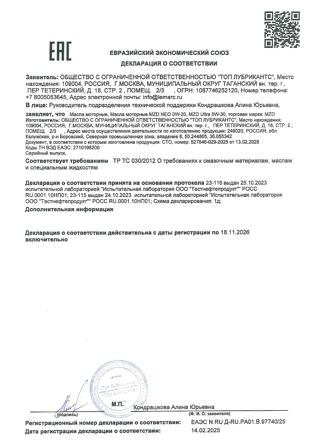 Новая линейка премиальных масел MZD специально разработана и произведена по заказу ООО "Мазда Мотор Рус" на современном заводе Топ Лубрикантс (бывший завод Total) с использованием высококачественных импортных базовых масел и премиальных пакетов присадок. Качество масел MZD аналогично зарекомендовавшим себя оригинальным маслам Mazda Supra-X и Ultra. Моторные масла MZD предназначены для использования в автомобилях Mazda, в том числе с двигателями Skyactiv. MZD Ultra 5W-30 - высококачественное синтетическое моторное масло, подходящее для современных многоклапанных двигателей, в том числе оснащенных непосредственным впрыском топлива и турбонаддувом. Современные присадки обеспечивают чистоту и защиту двигателя от образования отложений. Высокая термоокислительная стабильность позволяет маслу сохранять рабочие свойства между заменами. MZD Ultra 5W-30 соответствует спецификациям API SN Plus и ACEA A5/B5.