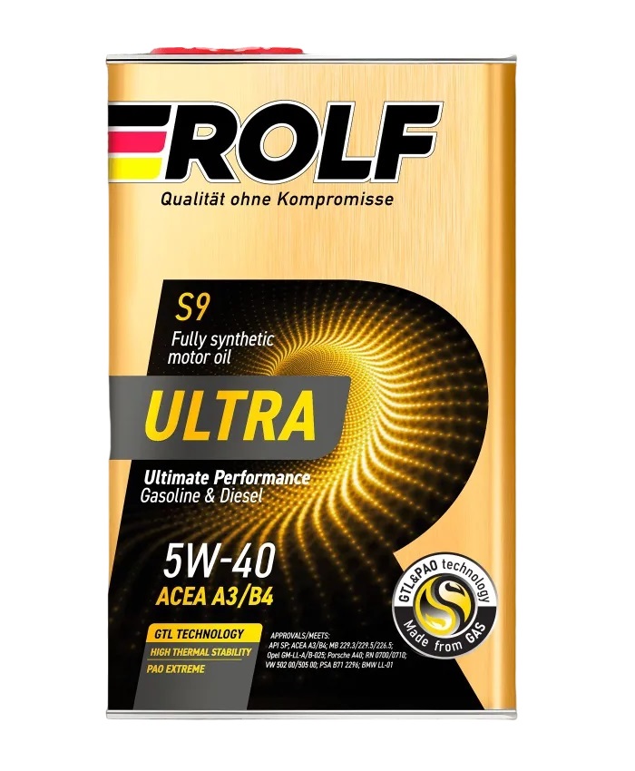 Rolf Ultra 5W-40 A3/B4 SP - полностью синтетическое моторное масло на основе технологиии GTL + PAO и многофункционального пакета присадок, гарантирует легкий запуск двигателя при низких температурах, превосходную защиту двигателя от износа, препятствует образованию отложений, обеспечивая его максимальную мощность и производительность в любых условиях эксплуатации. Рекомендовано к применению в современных легковых автомомобилях с бензиновым или дизельным двигателем, включая турбированные с непосредственным впрыском, где требуется уровень эксплуатационных свойств ACEA A3/B4 или API SP/CF и ниже. Использование только оригинальных пакетов присадок крупнейших мировых компаний обеспечивает полное соответствие указанным допускам автопроизводителей. Поддерживает максимальную производительность двигателя, защищая его от отложений и износа. Легкий старт двигателя при экстремально низких температурах с первой секунды. Высокий индекс вязкости обеспечивает оптимальную работу масла в разных температурных режимах. Масло сохраняет свои свойства в разных условиях эксплуатации, обеспечивая максимально эффективную работу двигателя. До 40% меньше потерь от испарения в сравнении с маслом стандарта ACEA A3/B4 по данным оценки испаряемости масла по методу ASTM D5800 NOACK volatility test, что позволяет экономить на доливке масла. Одобрения и соответствия: API SP; ACEA A3/B4; MB 229.3/MB 229.5/MB 226.5; Opel GM-LL-A/B-025; Porsche A40; RN 0700/0710; VW 502 00/VW 505 00; PSA B71 2296; BMW LL-01.