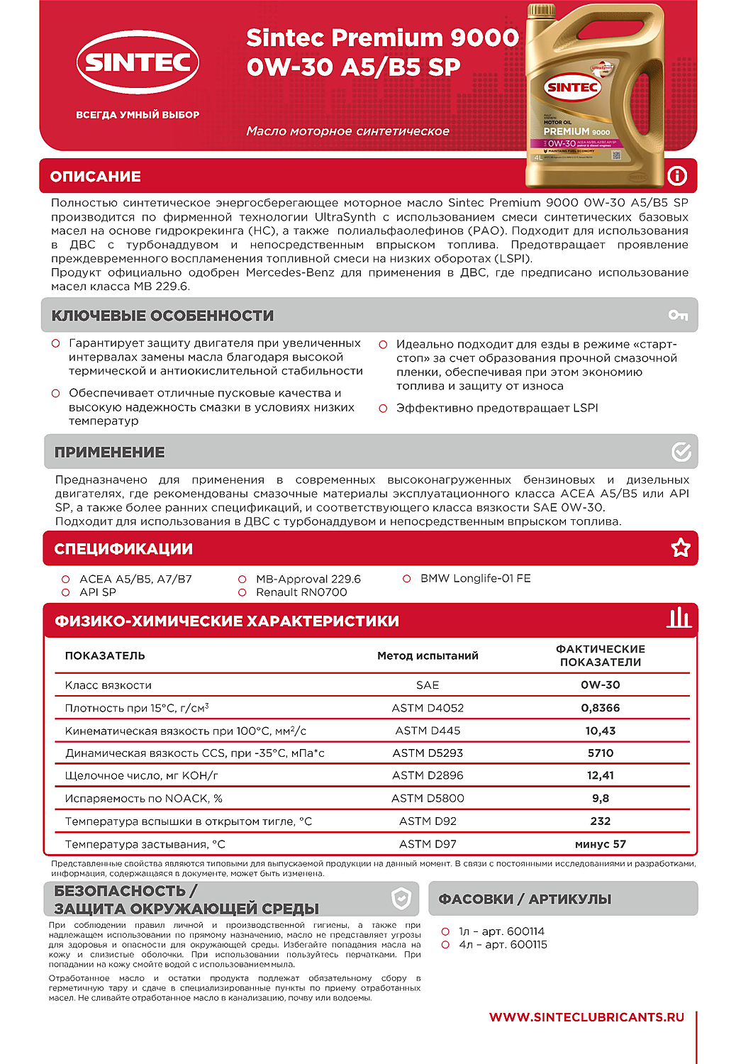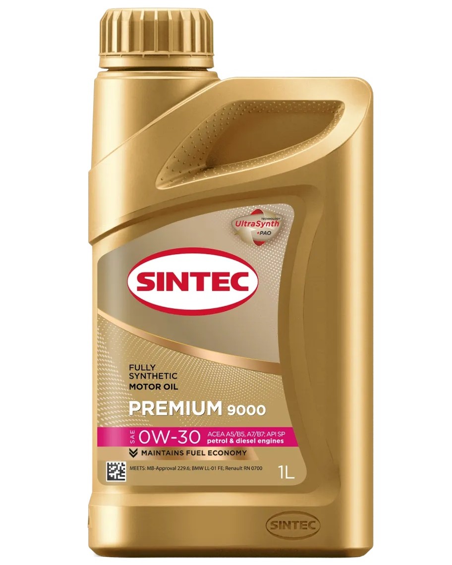 Полностью синтетическое энергосберегающее моторное масло Sintec Premium 9000 0W-30 A5/B5 SP произведено по фирменной технологии UltraSynth с использованием смеси синтетических базовых масел на основе гидрокрекинга (HC), а также полиальфаолефинов (PAO). Подходит для использования в ДВС с турбонаддувом и непосредственным впрыском топлива. Предотвращает проявление преждевременного воспламенения топливной смеси на низких оборотах (LSPI). Продукт официально одобрен Mercedes-Benz для применения в ДВС, где предписано использование масел класса MB 229.6. Предназначено для достижения наилучших показателей топливной экономичности в самых современных двигателях европейских автомобилей. Продукт официально одобрен Mercedes-Benz в качестве энергосберегающего моторного масла для применения в двигателях M270, M274, M276. Обеспечивает отличные пусковые качества и высокую надежность смазки в условиях низких температур. Высокая термическая и антиокислительная стабильность гарантируют защиту двигателя при увеличенных интервалах замены масла. За счет образования прочной смазочной пленки идеально подходит для режима езды старт-стоп. Защита от LSPI. Спецификации: ACEA A5/B5, ACEA A7/B7, API SP, МВ 229.6, Renault RN0700, BMW LongLife-01 FE.