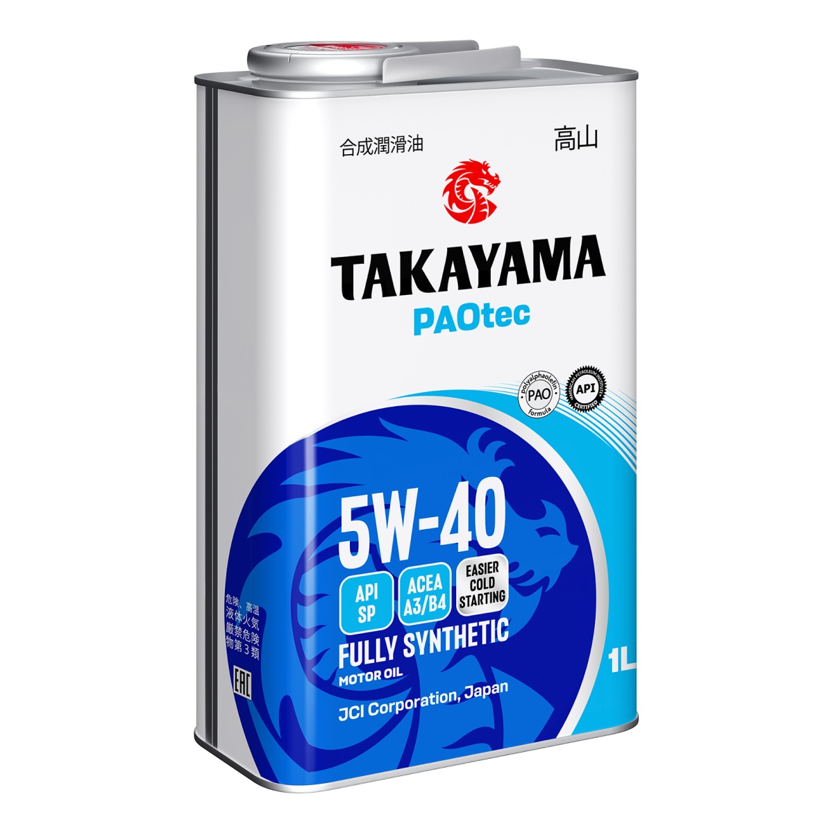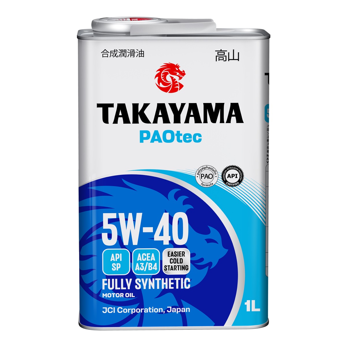 Полностью синтетическое моторное масло Takayama PAOtec SAE 5W-40 ACEA A3/B4 API SP предназначено для всесезонного использования в бензиновых и дизельных двигателях легковых автомобилей, внедорожников, микроавтобусов и лёгких грузовиков, эксплуатирующихся в самых различных условиях. Благодаря использованию полностью синтетических базовых масел IV группы (ПАО) и современного многофункционального пакета присадок обладает отличной термической стабильностью и стойкостью к высокотемпературному окислению, надёжно защищает двигатель от износа и образования отложений даже в режиме максимальных нагрузок, имеет хорошие низкотемпературные свойства, способствуя лёгкому запуску двигателя при низких температурах. Продукт разработан с учетом требований по предотвращению преждевременного воспламенения при низких скоростях (LSPI), предъявляемых современными высоконагруженными бензиновыми двигателями, оснащенными турбонаддувом и непосредственным впрыском, и совместим с каталитическими нейтрализаторами выхлопных газов. Соответствие требованиям ACEA A3/B4 и API SP гарантирует возможность применения в современных двигателях автомобилей китайского производства: CHANGAN, CHERY, GAC, LIFAN, HAVAL, JAC, GEELY, BYD, FAW, GREAT WALL и других, когда требуется уровень свойств ACEA A3/B4 и API SP или ниже и вязкость SAE 5W-40. Спецификации: API SP, ACEA A3/B4; BMW LL-01; MB 229.3/229.5, Porsche A40, PSA B71 2296; Renault RN0700/0710, VW 502.00/505.00.