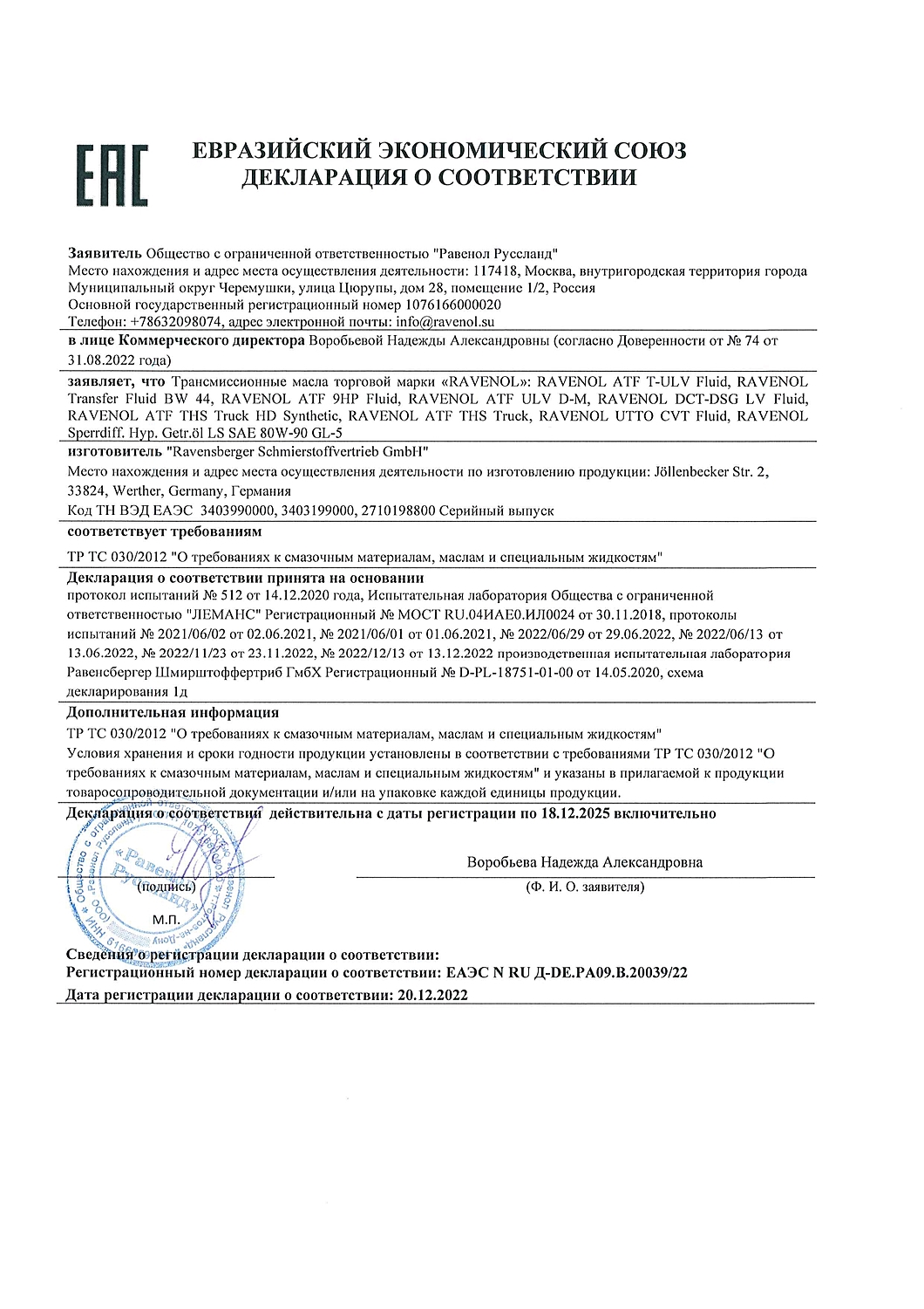 Ravenol DCT-LV Fluid - полностью синтетическое современное PAO масло на основе полиальфаолефина для автоматических DCT коробок передач (коробка передач с двойным сцеплением) со специальными присадками и ингибиторами, которые обеспечивают правильную работу трансмиссии с двойным сцеплением. Гарантирует оптимальную мощность трансмиссии и отличную работу сцепления как при экстремальных нагрузках в середине лета, так и при низких температурах зимой. Было разработано для использования в 7-ступенчатой трансмиссии третьего поколения с двойным сцеплением компанией Magna GETRAG специально для Daimler допуск MB 239.21. Для трансмиссий с двойным сцеплением различных производителей автомобилей, таких как BMW, Ford, Mercedes, VW/Audi. Используется для смазки сцеплений в 7-ступенчатых трансмиссиях Magna GETRAG с двойным сцеплением (7DCT300 / 6DCT200 / 6DCT150). Может использоваться в трансмиссиях с прямым переключением передач с мокрым или сухим сцеплением. Рекомендации: BMW DCTF-2, Ford F-DC, Ford WSS-M2C218-A1, Great Wall GW7DCT1, Great Wall GWM 7DCT450, Hyundai/Kia 04300-2N110 WDHO-1, MB 239.21, Renault 7711785243, Renault DW5, VW G 055 529 A2. Ravenol DCT-LV Fluid обеспечивает: -очень хорошую смазывающую способность даже при низких температурах; -высокий, стабильный индекс вязкости; -защиту от износа, коррозии и пенообразования; -превосходные характеристики вязкости и температуры; -высокую термическую и окислительную стабильность; -нейтральное поведение по отношению к уплотнительным материалам; -стабильную смазочную пленку при экстремальных нагрузках летом. Соответствует требованиям: BMW DCTF-2, Chery 730DHB/DHC 7DCT300, Chery 738DHA 7DCT380, Ford F-DC, Ford WSS-M2C 218-A1, Kunlun DCTF-7S, MB 236.22, MB 239.21, Pentonsin FFL-7A, Renault DW5, Sinopec DCTF-GS, VW G 055 529.