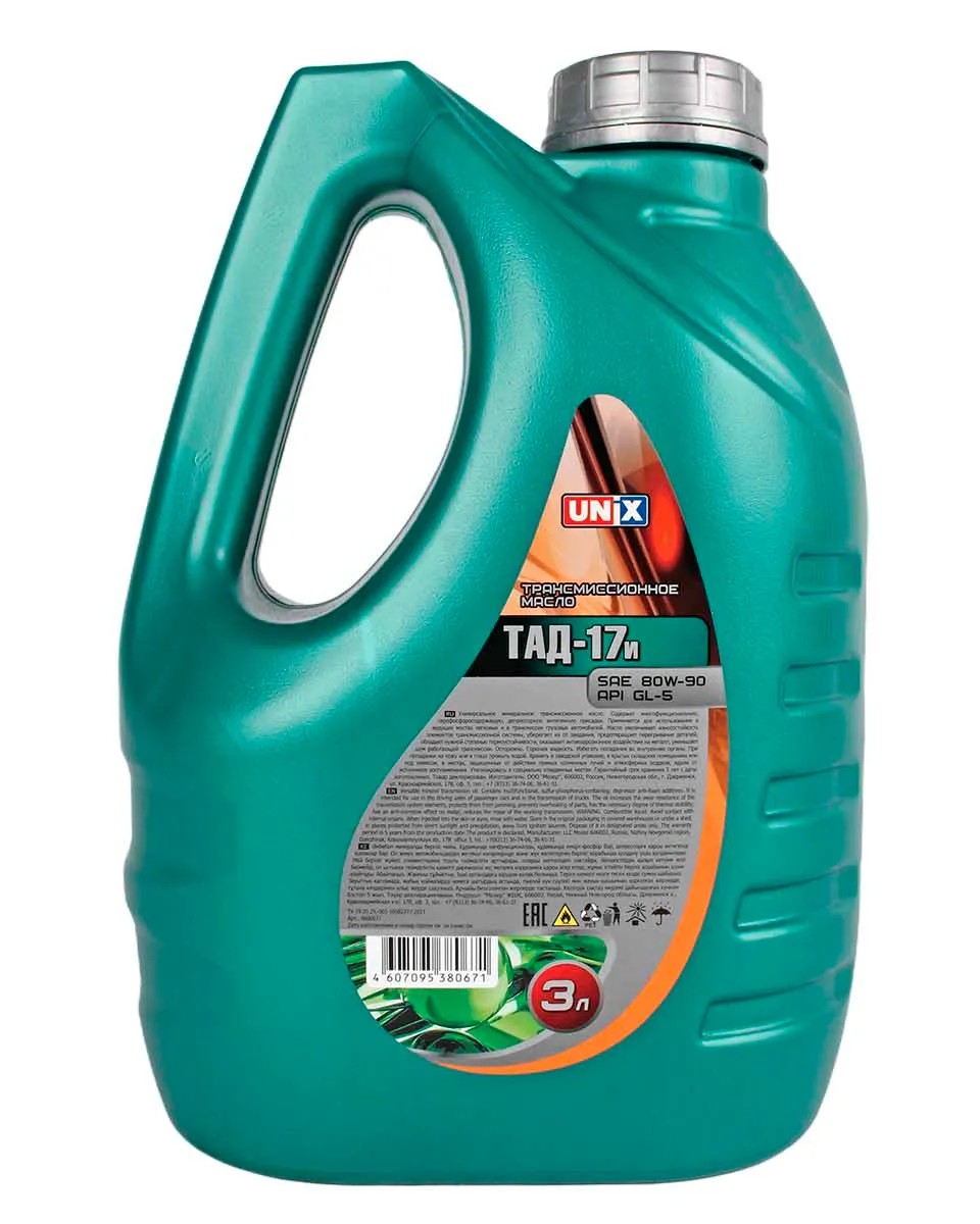 Unix ТАД-17и 80W-90 GL-5 — универсальное минеральное трансмиссионное масло. Содержит многофункциональную серофосфоросодержащую, депрессорную и антипенную присадки. Применяется для смазывания всех типов передач, в том числе и гипоидных, автомобилей и другой мобильной техники.