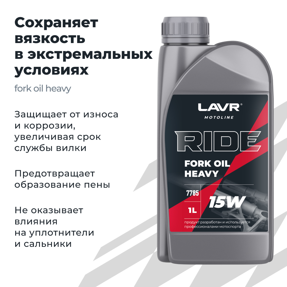 Вилочное гидравлическое масло LAVR RIDE FORK OIL 15W предназначено для всех типов телескопических вилок мототехники для шоссейного и внедорожного применения. Изготовлено на основе нефтяных масел глубокой очистки и высокотехнологичного пакета присадок. Содержит комплекс антифрикционных, антикоррозийных и противопенных присадок, что сохраняет характеристики подвески и обеспечивает надёжную эксплуатацию телескопических вилок и амортизаторов. Не выпадает в осадок. Позволяет эксплуатировать мотоцикл в самых разнообразных климатических условиях. Сохраняет вязкость при экстремальных давлениях и температурах. Предотвращает образование пены. Защищает от износа и коррозии, увеличивая срок службы деталей вилки. Не оказывает влияния на уплотнители и сальники. Допускается смешивание с другими вилочными маслами.