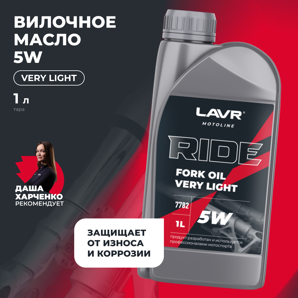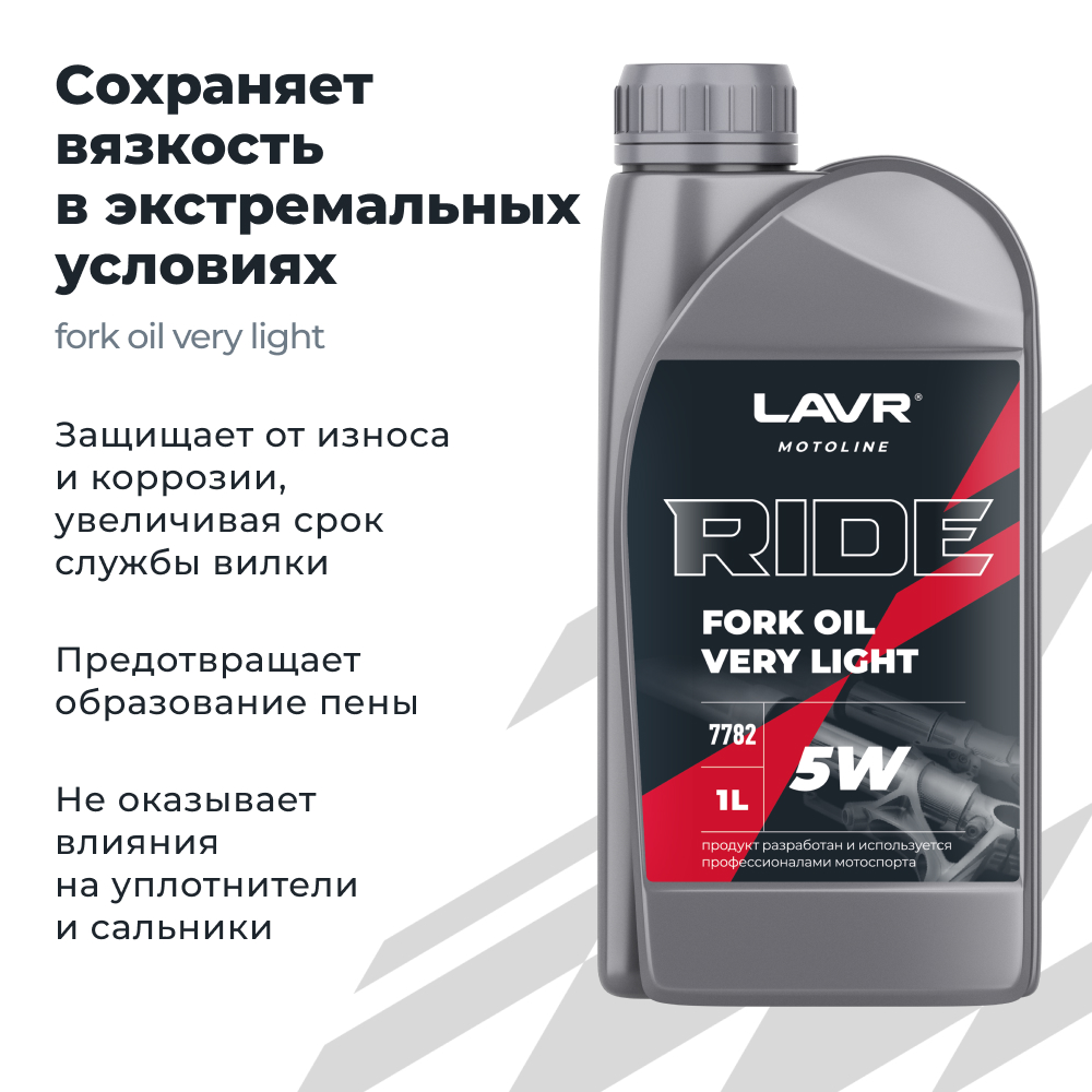 Вилочное гидравлическое масло LAVR RIDE FORK OIL 5W предназначено для всех типов телескопических вилок мототехники для шоссейного и внедорожного применения. Изготовлено на основе нефтяных масел глубокой очистки и высокотехнологичного пакета присадок. Содержит комплекс антифрикционных, антикоррозийных и противопенных присадок, что сохраняет характеристики подвески и обеспечивает надёжную эксплуатацию телескопических вилок и амортизаторов. Не выпадает в осадок. Позволяет эксплуатировать мотоцикл в самых разнообразных климатических условиях. Сохраняет вязкость при экстремальных давлениях и температурах. Предотвращает образование пены. Защищает от износа и коррозии, увеличивая срок службы деталей вилки. Не оказывает влияния на уплотнители и сальники. Допускается смешивание с другими вилочными маслами.