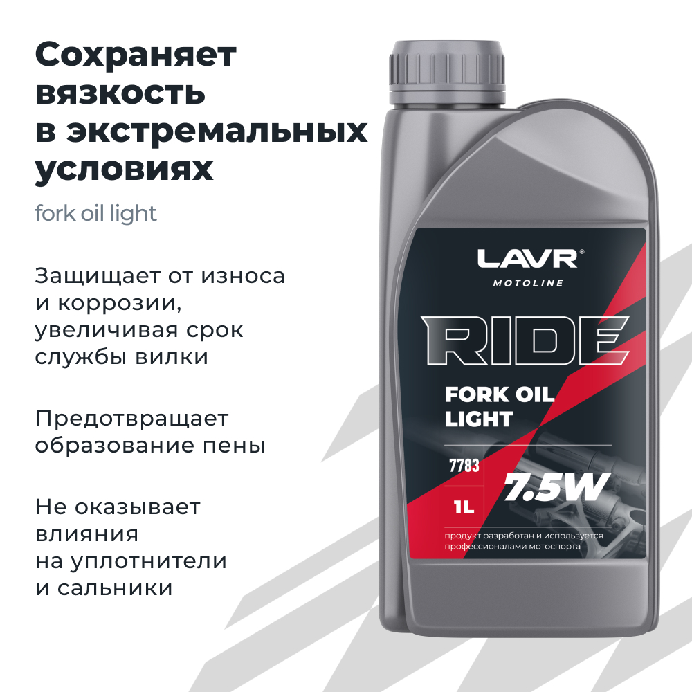 Вилочное гидравлическое масло LAVR RIDE FORK OIL 7,5W предназначено для всех типов телескопических вилок мототехники для шоссейного и внедорожного применения. Изготовлено на основе нефтяных масел глубокой очистки и высокотехнологичного пакета присадок. Содержит комплекс антифрикционных, антикоррозийных и противопенных присадок, что сохраняет характеристики подвески и обеспечивает надёжную эксплуатацию телескопических вилок и амортизаторов. Не выпадает в осадок. Позволяет эксплуатировать мотоцикл в самых разнообразных климатических условиях. Сохраняет вязкость при экстремальных давлениях и температурах. Предотвращает образование пены. Защищает от износа и коррозии, увеличивая срок службы деталей вилки. Не оказывает влияния на уплотнители и сальники. Допускается смешивание с другими вилочными маслами.